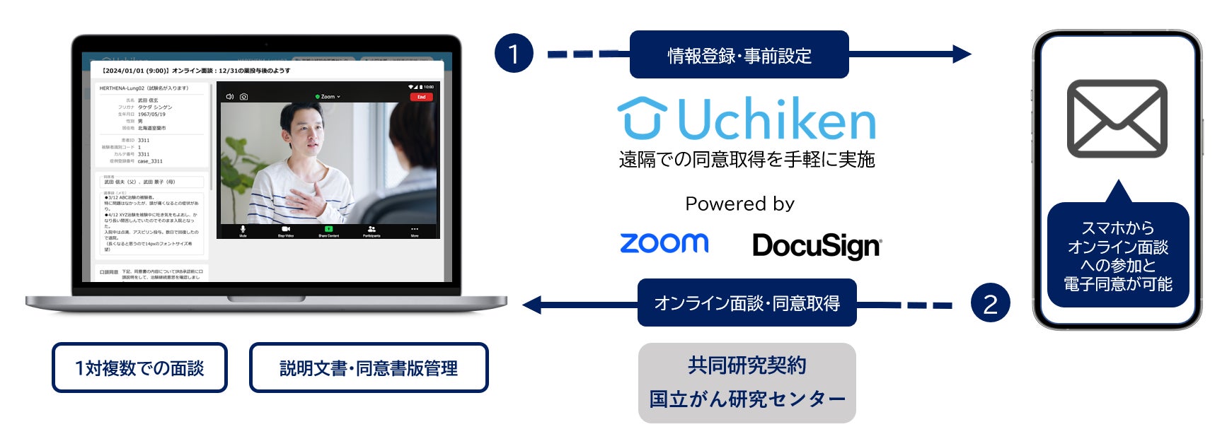簡単に遠隔での治験が実現できるプラットフォーム「Uchiken」の提供を開始。 ZoomおよびDocuSign eSignatureを導入し、低コストでeConsent(電子同意)の仕組みを実現。