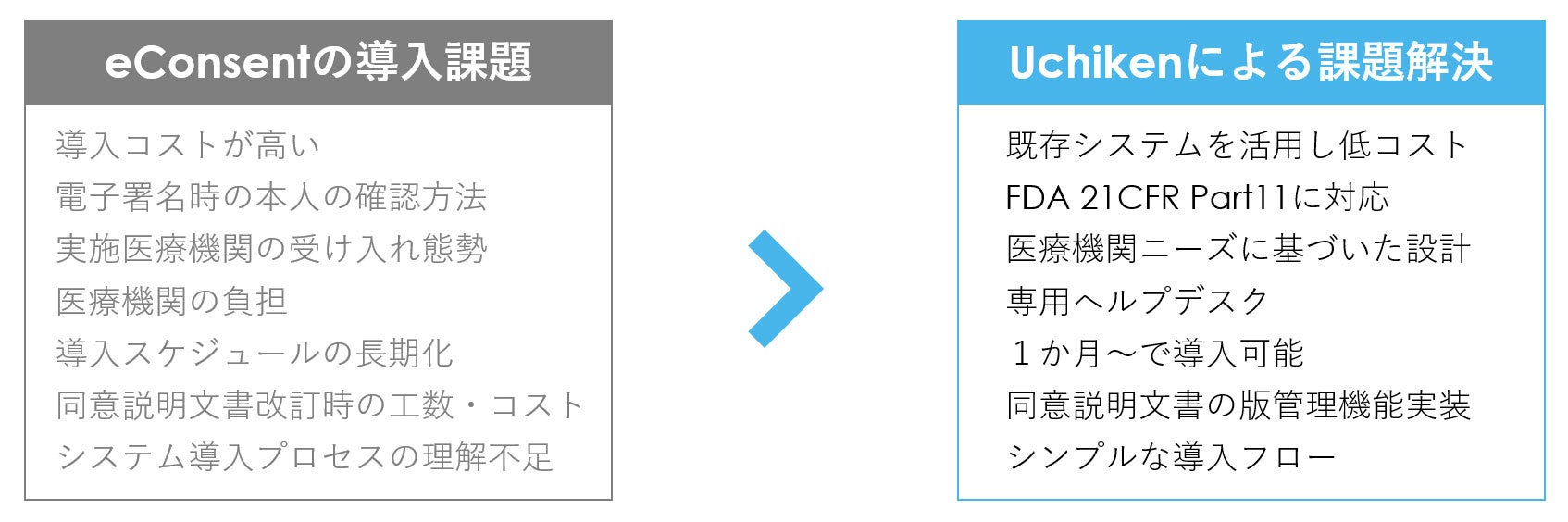 「Uchiken」は、このガイダンスに準拠し、eConsentの導入課題を解決するDCTプラットフォームです。Zoom MeetingsやDocuSign eSignatureといった既存のシステム基盤を活用することで開発コストを削減。国立がん研究センターの支援を得て、医療現場に必要な機能や利便性に配慮した設計を行っています。また米国食品医薬品局が制定したFDA 21CFR Part11にも対応し、従来の紙の記録や手書きの署名と法的に同等の効力を持つことを保証しています。(※3)