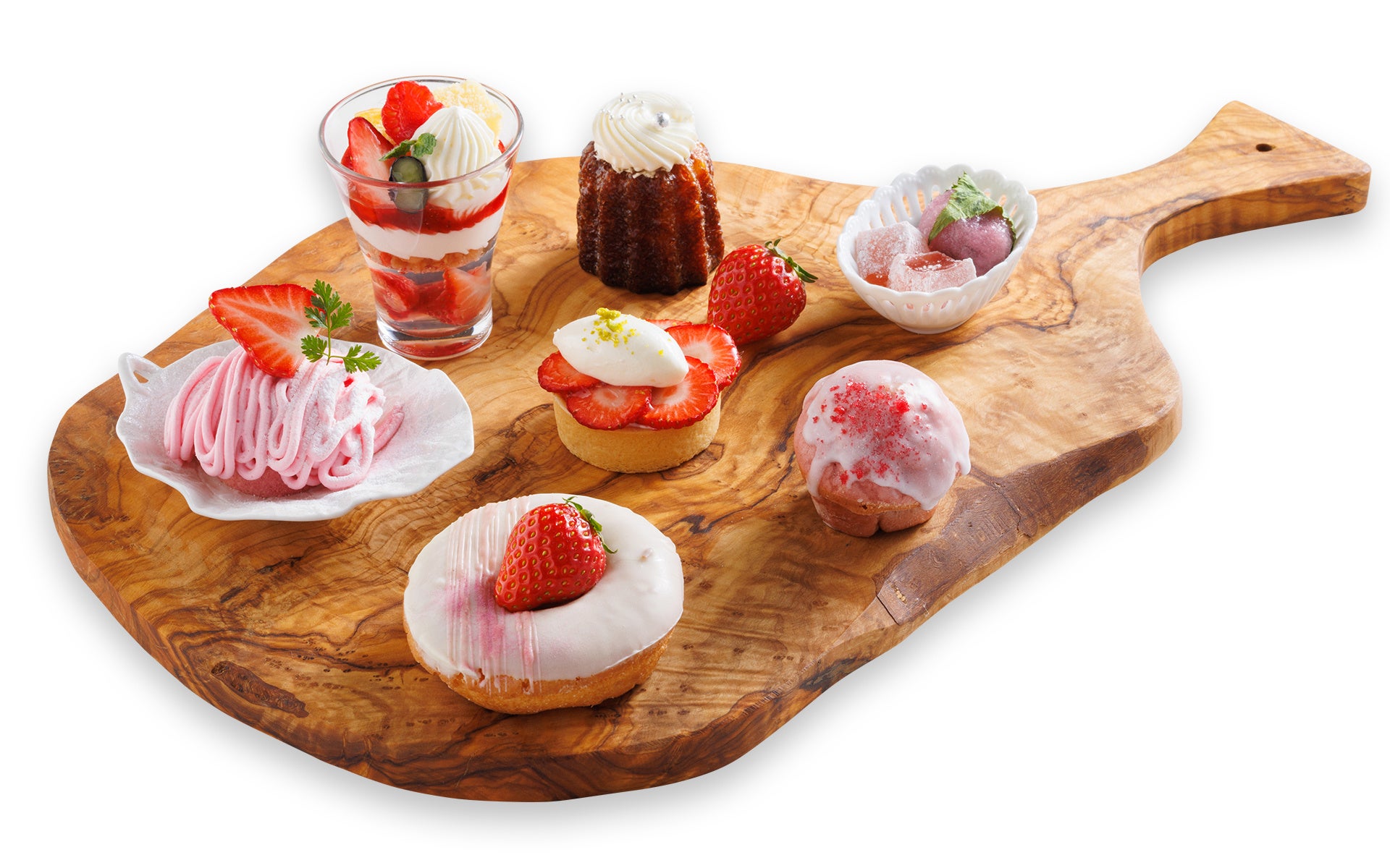 | ◎桜ベリーのモンブラン 苺のロールケーキにフレッシュな苺をのせて、桜のホイップクリームをモンブラン状に絞りました。リッチな桜の風味は、春ならではの味わいです。 ◎苺のクリアミニパフェ 透明なフルーツゼリー、グラノーラ、生クリーム、ストロベリーソースの上に、クリームとベリーをトッピングしました。 ◎カヌレ フランスの伝統的なお菓子“カヌレ”はモチモチで、相性の良い生クリームをデコレーションしました。 ◎苺わらび餅と桜餅 苺の上品な甘さの“わらび餅”・桜の葉で餅菓子を包んだ“桜餅”は、春の和スイーツです。 ◎とちおとめメロンパン “とちおとめ”を贅沢に練りこんだメロンパンです。アイシングでコーティングし苺色のトッピングで華やかに仕立てました。 ◎さくら香るドーナツ ほんのりと桜の香りがするチョコでコーティングされた、淡い桜色のドーナツです。 ◎苺のタルト 苺を花びらに見立てて盛り付けした春らしいタルト。中のカスタードとふんわりと飾った生クリームとの相性は抜群です。 |