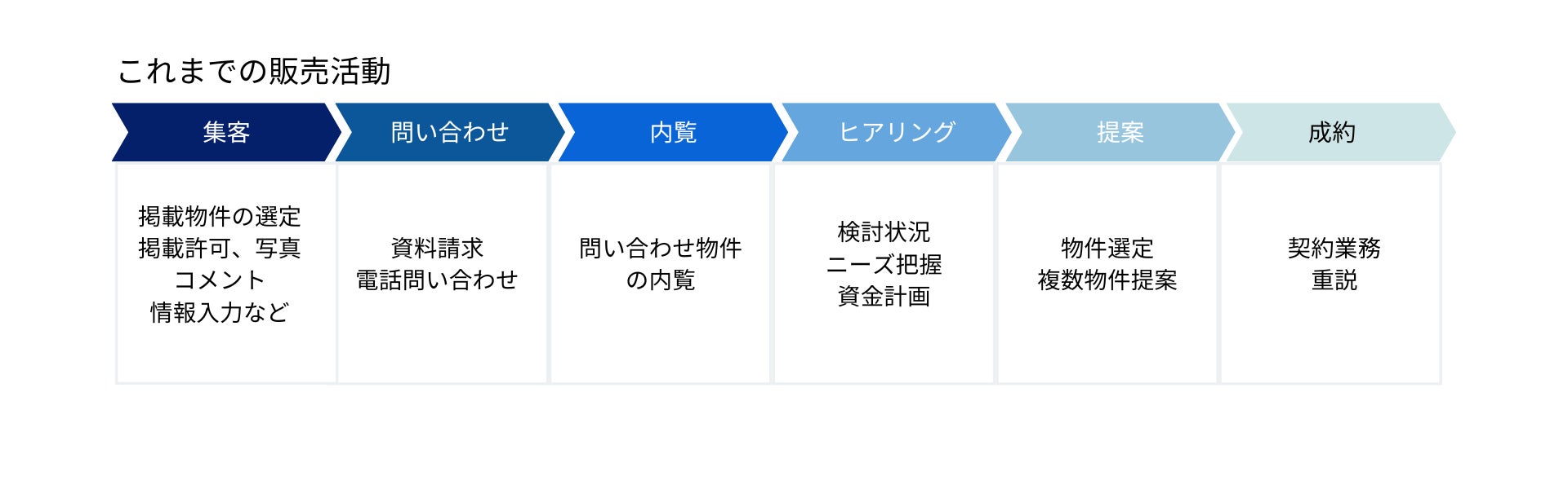 従来の不動産販売活動は、不動産会社が物件の写真撮影や文章作成の上、物件情報を各種媒体に掲載して集客を行ったり、集客できた見込み顧客の情報に対し1つ1つ電話やメールなどで追客を実施し、内覧へと結びつけ、内覧の中でユーザーの希望条件のヒアリングを行ったりしてきました。