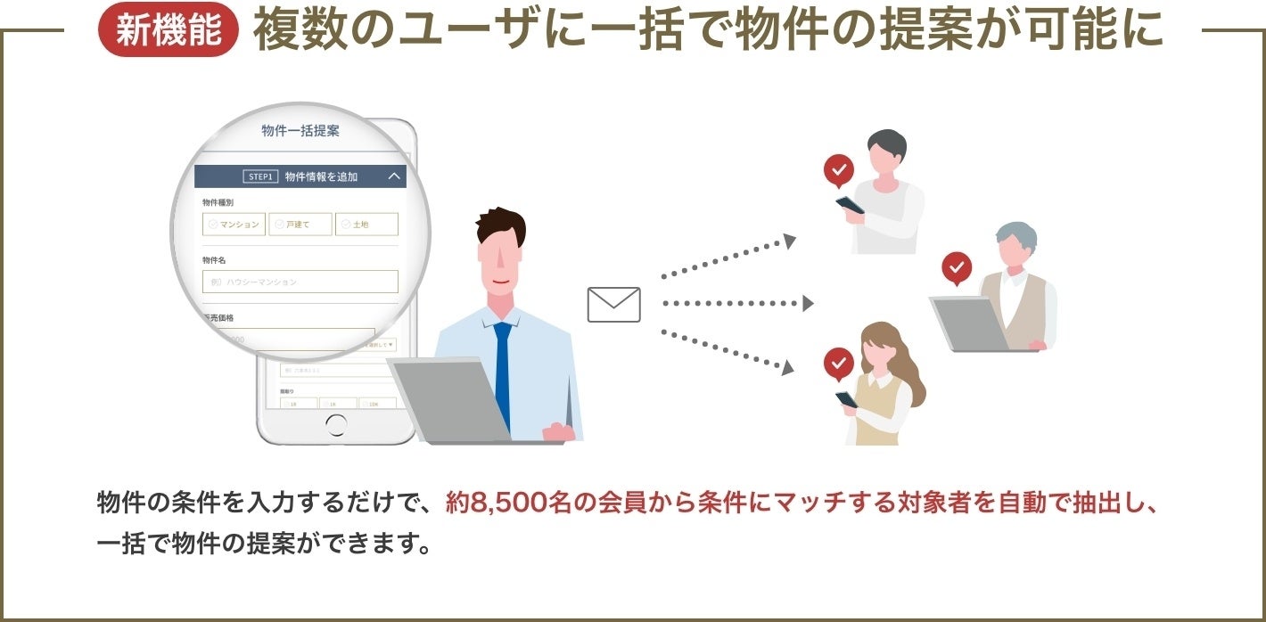 物件一括提案機能は、不動産会社がお持ちの物件情報を一括でお届けする機能です。
