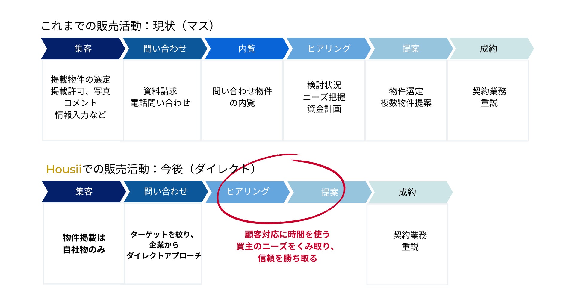 一方、Housiiを利用した販売活動では、物件掲載や初期対応の必要がなく、また、約30項目の希望条件を事前に把握した上で見込み顧客にダイレクトにアプローチすることが可能です。