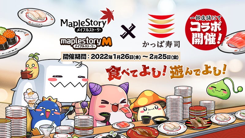 オンラインゲーム配信事業を行う株式会社ネクソン(本社:東京都港区、代表取締役社長:Owen Mahoney/オーウェン・マホニー、東証:3659、以下 ネクソン)は、PC向けにサービス提供中のアクションオンラインゲーム『メイプルストーリー』、およびiOS/Android向けに配信中の『メイプルストーリーM』の両タイトルにおいて、2022年1月26日(水)より、コロワイドグループのカッパ・クリエイト株式会社(本社:神奈川県横浜市)が運営する回転寿司チェーン「かっぱ寿司」とのコラボレーションキャンペーンを開始いたしました。