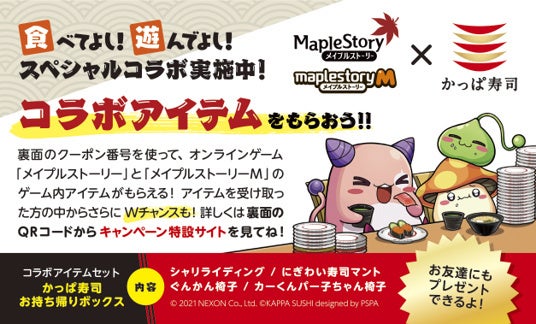 かっぱ寿司の対象店舗にて、店内飲食1,000円以上(税込)ご利用いただくと、クーポン番号入り来店者カードをプレゼントいたします。『メイプルストーリー』、『メイプルストーリーM』のゲーム内にてそれぞれのクーポン番号を入力いただくと、4つのコラボアイテムがセットでもらえます。