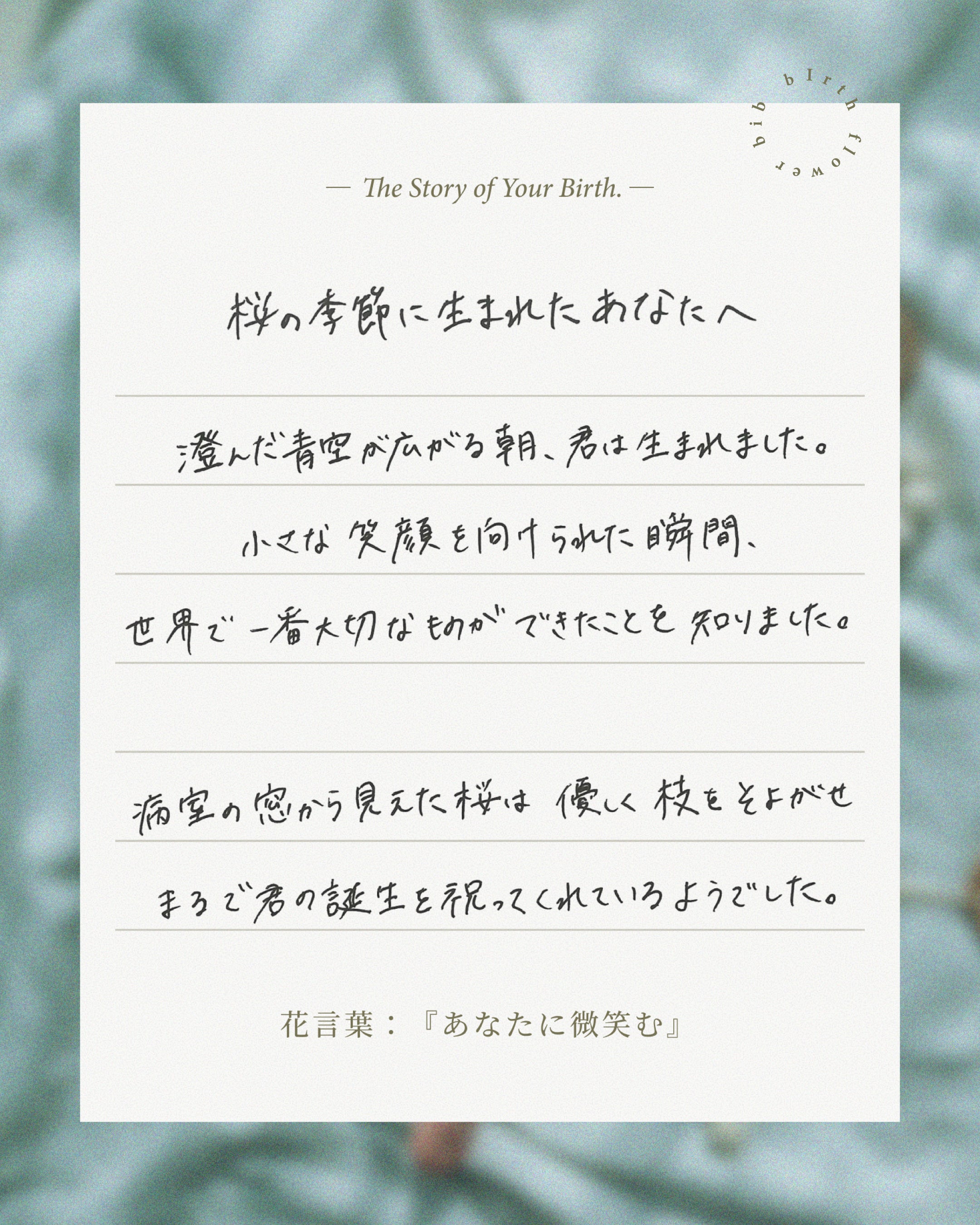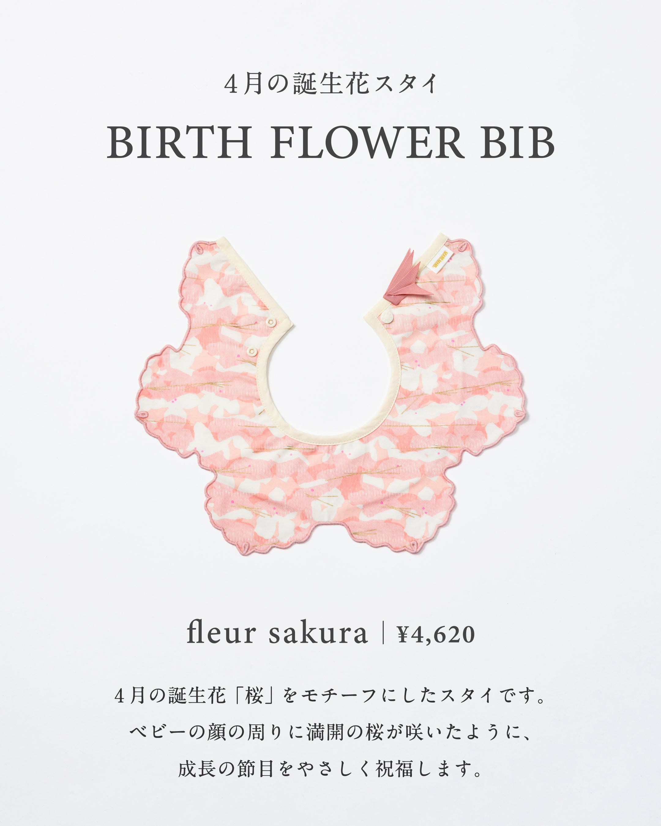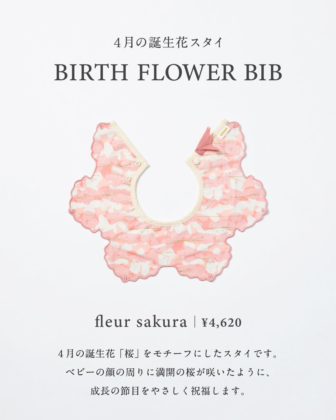 「桜のように、多くの人に愛され、美しく咲き誇ってほしい」という願いを込めた、春生まれのベビーのための特別な一枚です。
