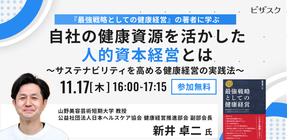 【11/17(木)16時】無料オンラインセミナー「『最強戦略としての健康経営』の著者に学ぶ、自社の健康資源を活かした人的資本経営とは〜サステナビリティを高める健康経営の実践法〜」を開催