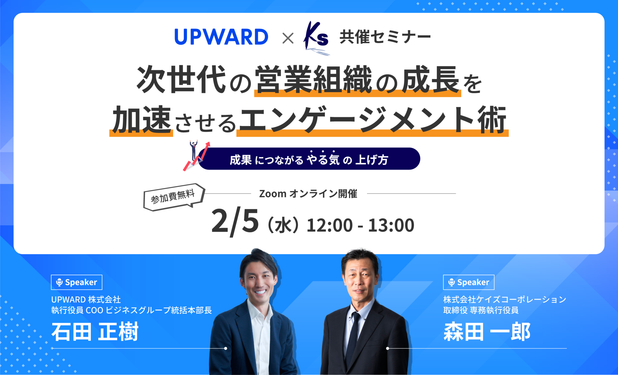 UPWARD株式会社(所在地:東京都千代田区、代表取締役社長 CEO:金木 竜介、以下 UPWARD)は、2025年2月5日(水)に「次世代の営業組織の成長を加速させるエンゲージメント術〜成果につながるやる気の上げ方〜」と題し、無料オンラインセミナーを開催します。 本セミナーは、株式会社ケイズコーポレーション(所在地:東京都港区、代表取締役:神林 幸一、以下 ケイズコーポレーション)との共催となります。