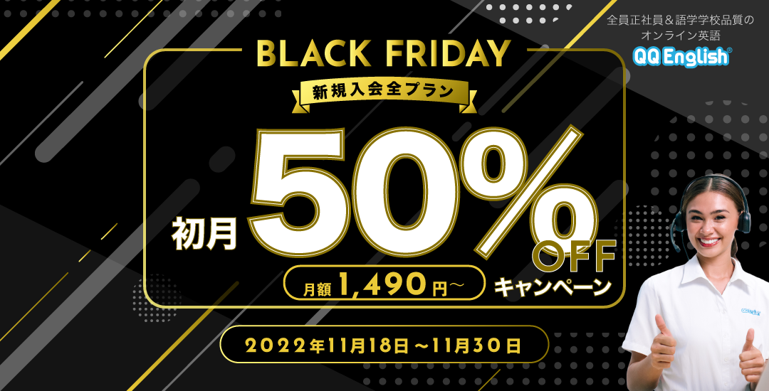 QQEnglishでは、皆様への日頃の感謝を込めて、ブラックフライデーセールとして、「新規入会 全プラン初月50%OFFキャンペーン」を実施いたします。