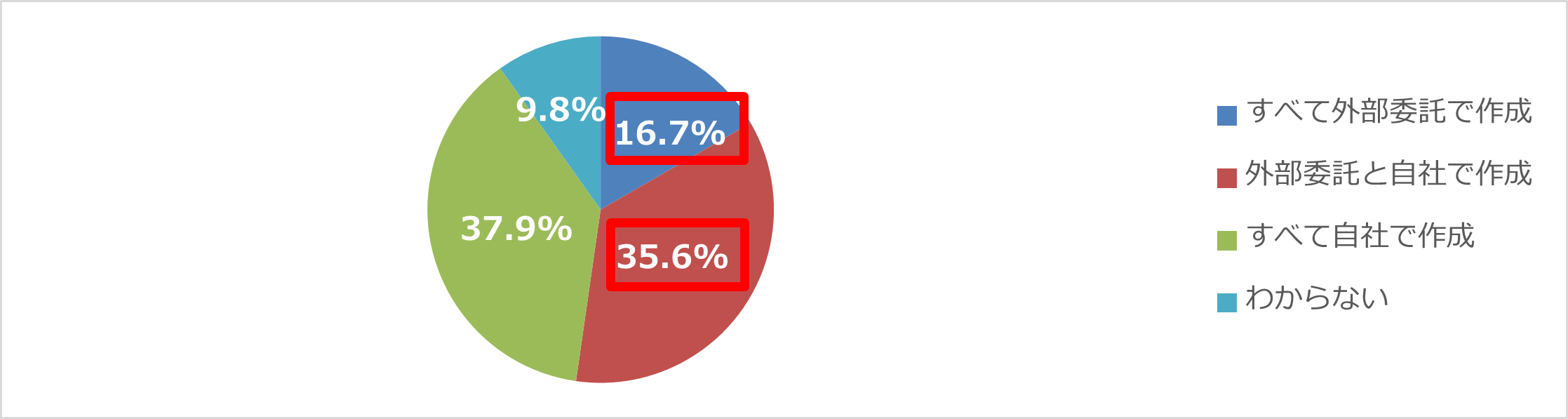 16.7%(22人)と「外部委託と自社で作成」35.6%(47人)を合計すると52.3%(69人)で、半数超えて外部委託している結果となった。