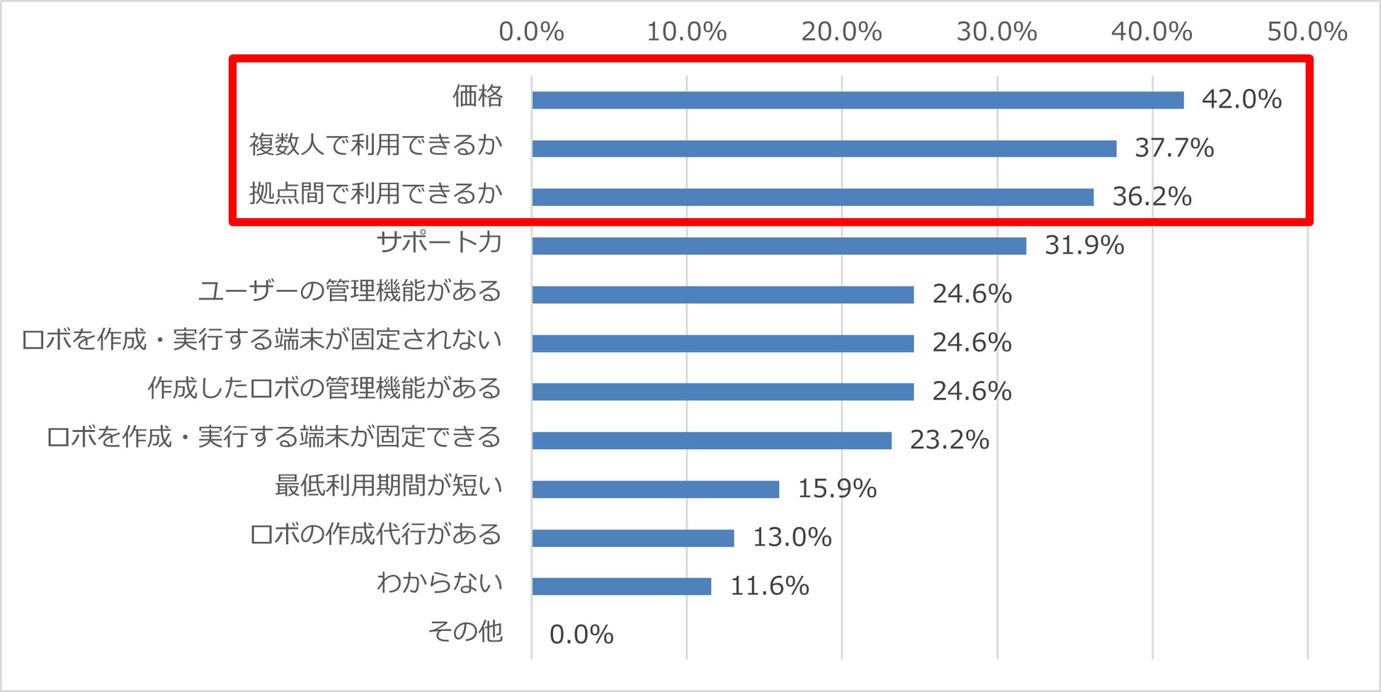 調査結果から、中小企業(従業員数300名以下)では、RPAを導入している企業は1割以下と低く、そのうち半数の企業が有料版を導入している(利用している)ことがわかりました。有料版を導入している企業は、導入時に最も重視したことは4割以上が「価格」であり、続いて「複数人で利用できるか」「拠点間で利用できるか」という導入後の運用を見据えた選択肢への回答率が高い結果となりました。