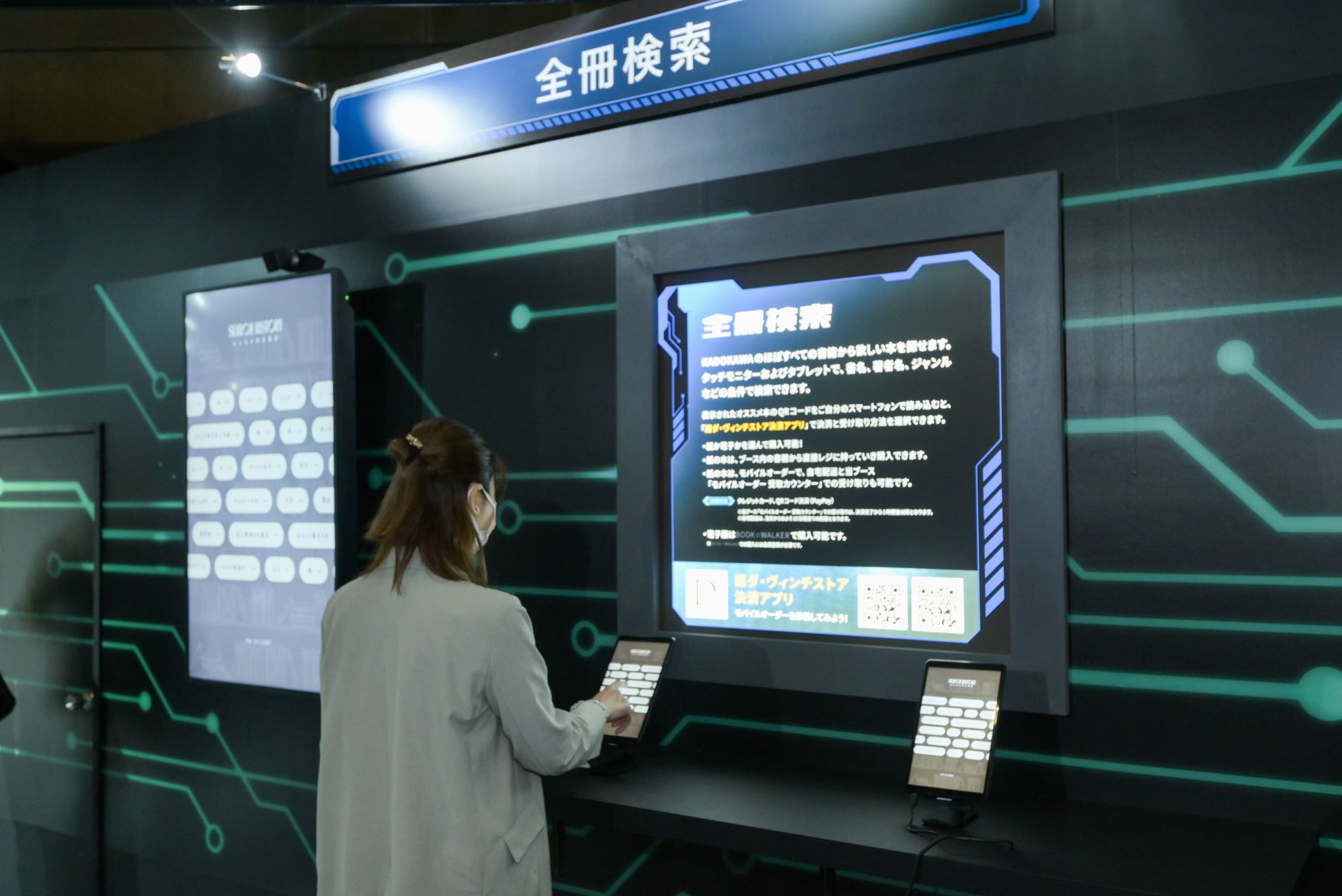 大型タッチモニターや手元のタブレットにて書名、著者名、ジャンルなどの条件で検索することで、KADOKAWAが扱うほぼすべての書籍から目当ての一冊をかんたんに見つけることが可能です。更に、 選択した本は、紙の書籍か電子書籍かを選択して、その場で購入可能です。購入した紙の書籍は店舗で受けとるほかに、注文客の自宅への配送指示など様々なニーズに対応します。巨大なデータベースを活用した検索から購入、配送までをデジタル化することでカウンター業務の省力化を実現します。