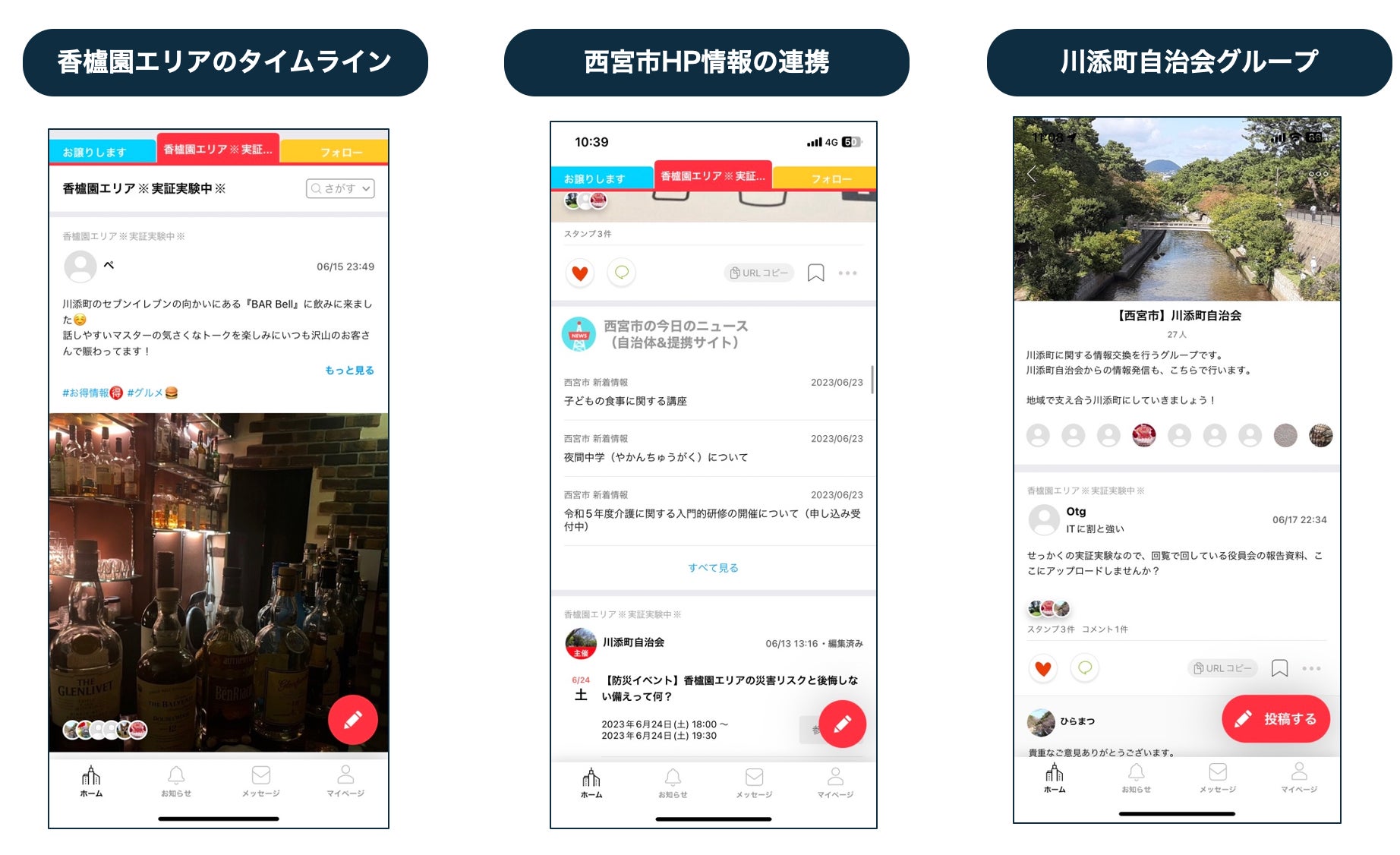 西宮市においても同様に、地域活動が70~80歳代の高齢者が中心になっており、持続可能な活動とするためには新たな担い手発掘が課題となっていました。地域活動又は市民活動に参加したことがない理由として、忙しくて時間が無い(42.9%)、どのような活動があるか分からない(39.5%)という回答が約4割となり、業務効率化や活動の認知向上が求められていました。そこで同市が官民連携による課題解決プロジェクト「Urban Innovation NISHINOMIYA」にて実証実験企業を募集し当社が採択され、実証期間を経てこの度本格活用となりました。