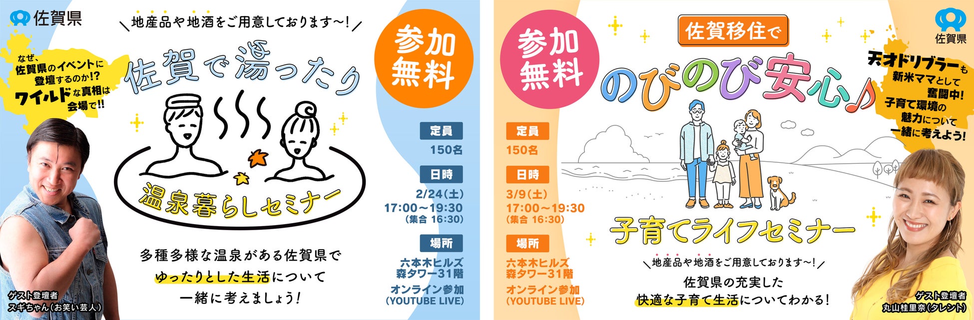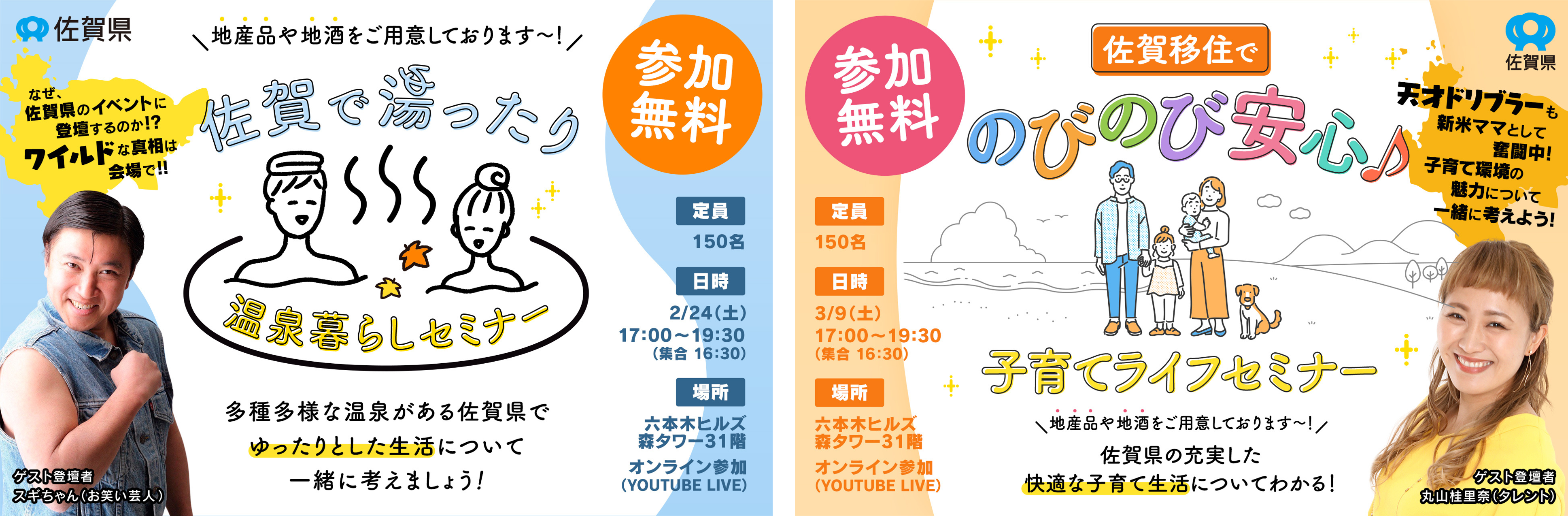 温泉資源や豊かな自然、ゆとりのある住環境や子育て環境など、充実の暮らしやすさを誇る佐賀県。当社ではこの度、「温泉」と「子育て」という2つの切り口からリアルな佐賀の暮らしをお伝えすべく移住イベントを2回実施する運びとなりました。