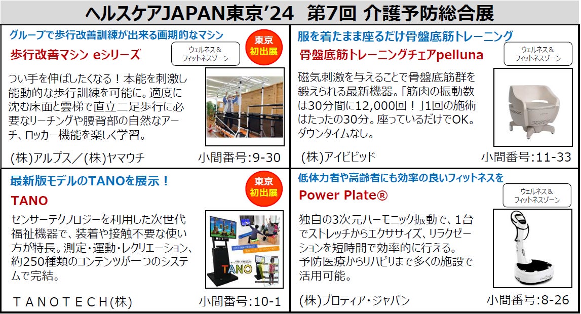 超高齢社会を迎えるわが国では、健康⻑寿を促進する商品やサービスのマーケットの急拡大に伴い、ニーズが急激に高まっている。『ヘルスケアJAPAN東京』では、トレーニングマシンや健康機器・認知症予防用品など「介護予防・健康長寿」に特化した商品・サービスが幅広く出展する。