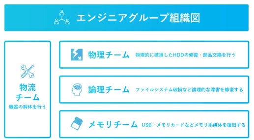 デジタルデータリカバリーには、40名以上のエンジニアが在籍しております。技術力の強化を行う目的で機器ごとに専門のチーム制をとり、以下4つのチームに分かれています。