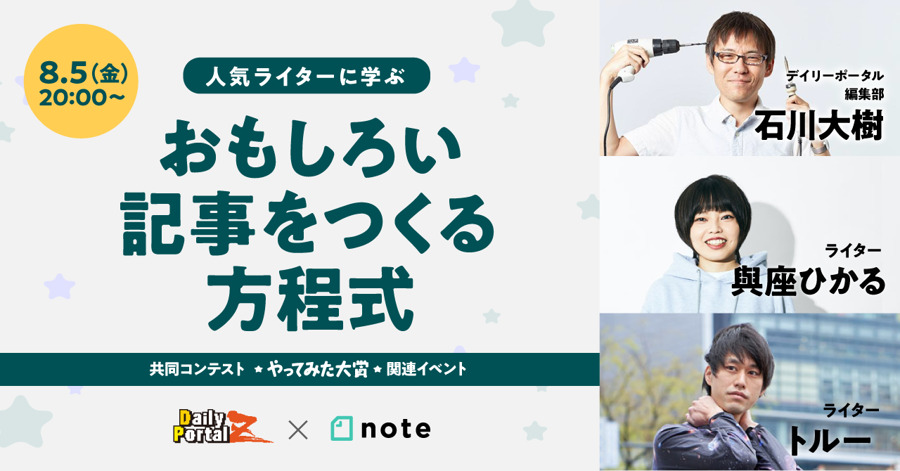 本コンテストと連動したイベントは、今回で2回目の開催となります。デイリーポータルZで活躍するライターの與座ひかるさん、トルーさん、そして同編集部の石川大樹さんをお招きして、おもしろい企画の考え方や記事執筆のコツをお話しいただく予定です。