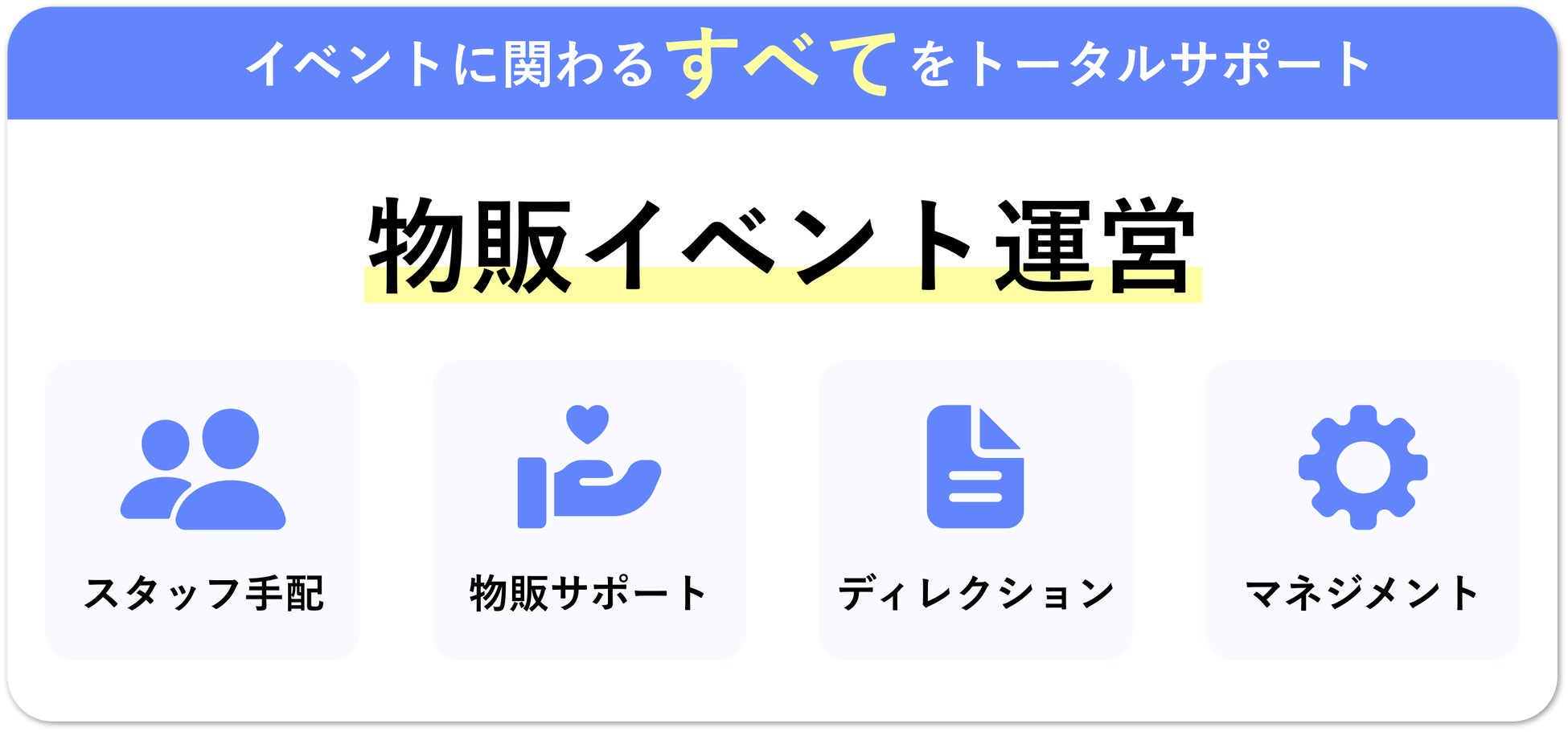 レジ機器の手配だけでなく、イベントそのものの「運営トータルサポート」も提供。企画・制作から当日の運営設計、スタッフ手配まで、イベントの特性や規模に合わせたサポートプランを一括で提案。さらに、物販ECや物流代行、イベントサイト制作など、終了後も含めた一連のプロセスをサポートすることで、「集客~販売~アフターセールス」までをワンストップで支援できる点が特長です。