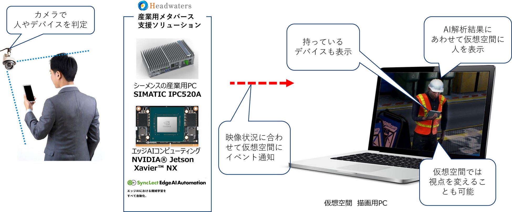 「産業用メタバース活用支援ソリューション」は、工場や店舗など遠隔地の状況をAIカメラで撮影。その画像をNVIDIAのエッジAIコンピューティング「NVIDIA® Jetson Xavier™ NX」を搭載した、シーメンスの産業向けPC「SIMATIC IPC520A」で判定し、データ化を行います。そのデータをリアルタイムで仮想空間(メタバース)に反映することで、安全性や効率性の向上に貢献します。