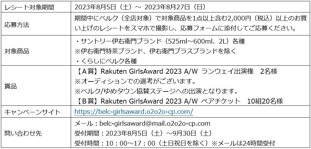 さらに、「Rakuten GirlsAward 2023 A/W」では「ベルク・ゆめタウン協賛ステージ」の開催も決定しました。これにあわせて本キャンペーンにご応募いただいた方を対象に、「ベルク・ゆめタウン協賛ステージ」のランウェイを歩いていただく出場権をかけたオーディションを実施します。本キャンペーンを通じ、ガールズアワードのランウェイを歩く夢をかなえるチャンスに、多くのご応募をいただけることを願っております。その他、本キャンペーンの概要については下記をご参照ください。