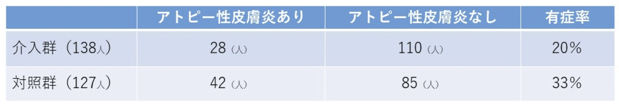 結果の評価方法:横浜市栄区役所で実施された4か月健診の際に、同一の1名の小児科医がどちらの群に属しているかはわからない状態で子どもの皮膚の状態を診察。United Kingdom Working Party (UKWP) criteria※1 に基づいてアトピー性皮膚炎の有無を判断。