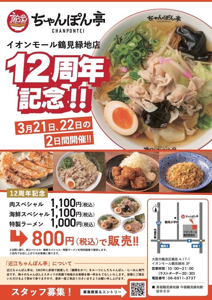 日頃のご愛顧に感謝を込めて、 「近江ちゃんぽん亭 イオンモール鶴見緑地店」 の12周年記念イベントを開催いたします!