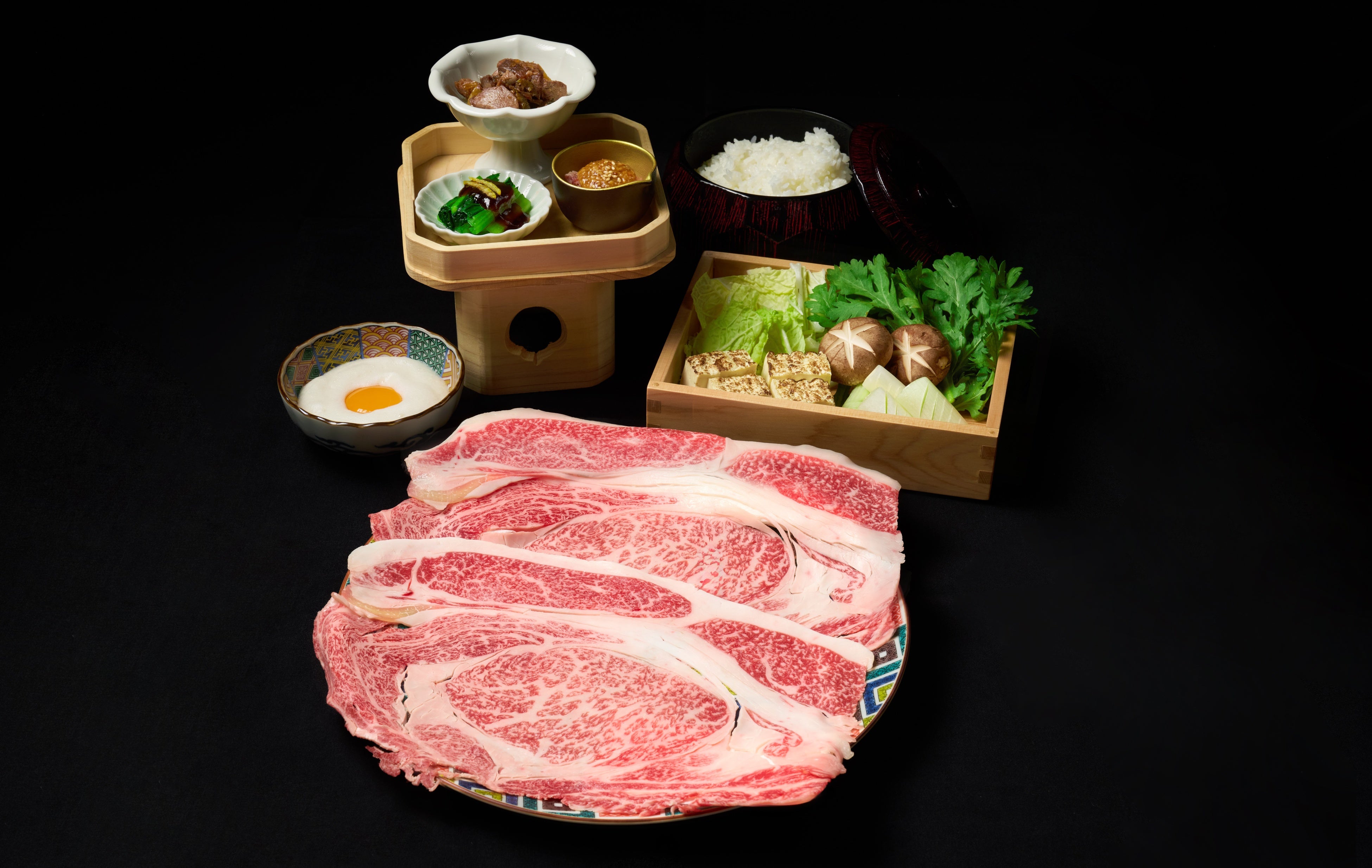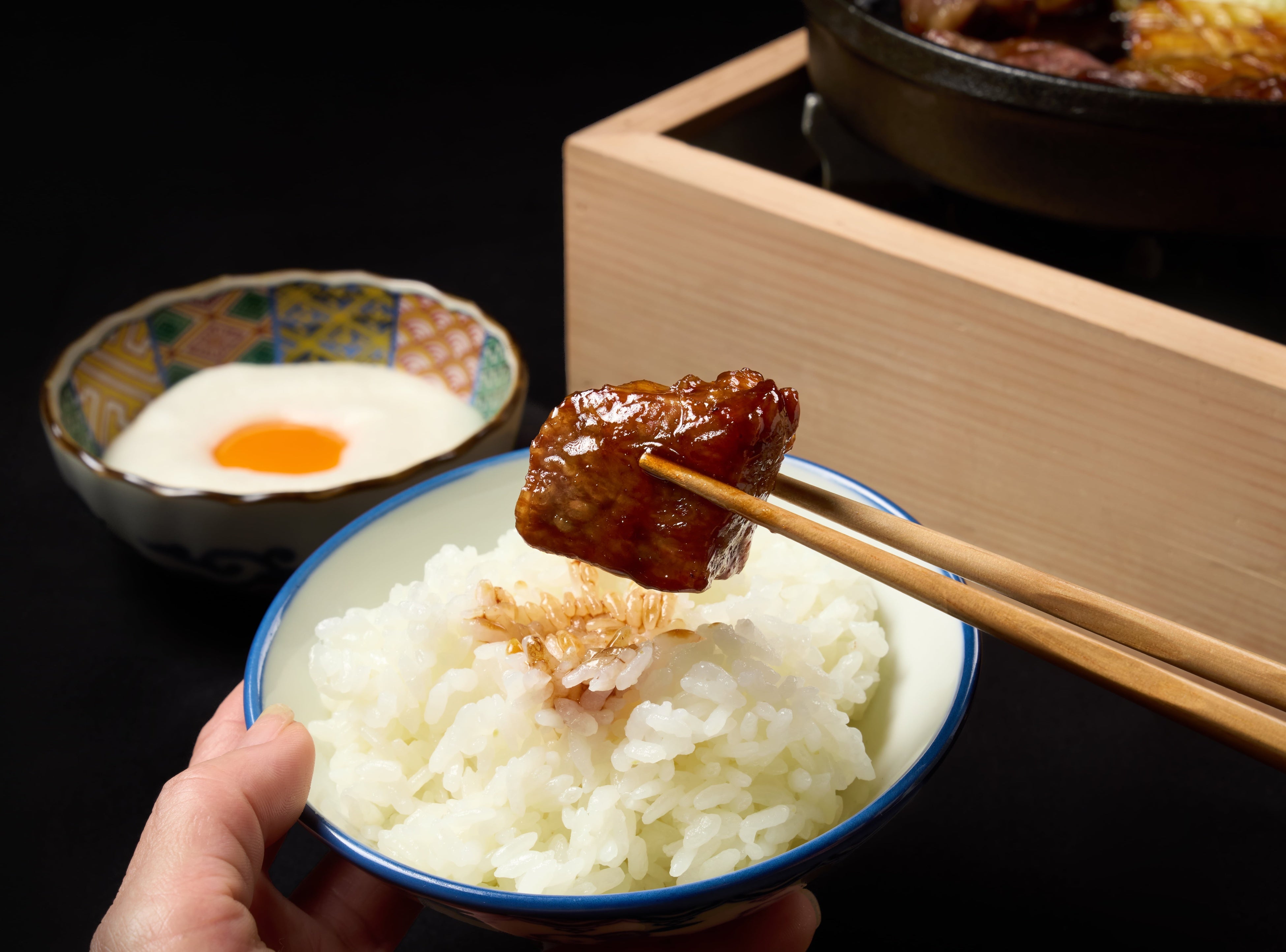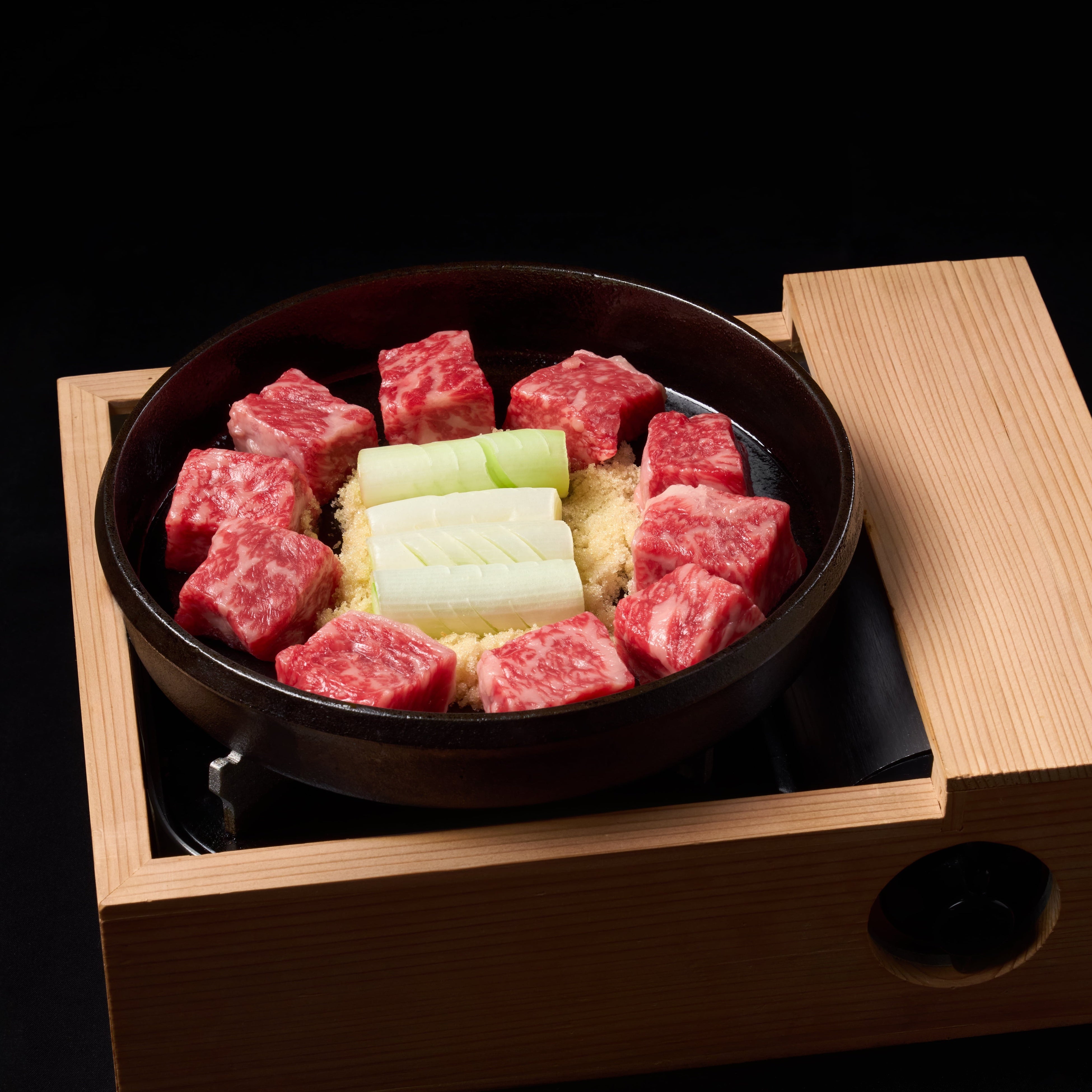 鍋に使われる角切り肉は割下に絡めても旨みが強く感じられるよう「ロース芯」を含む高級部位の国産牛リブロースを使用。