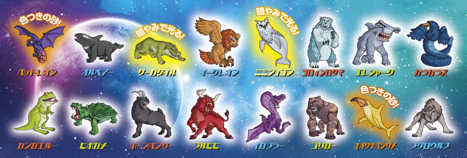 色付きの砂が入ったフィギュア(全2種)と、暗闇で光るフィギュア(全2種)のレアキャラも登場します!