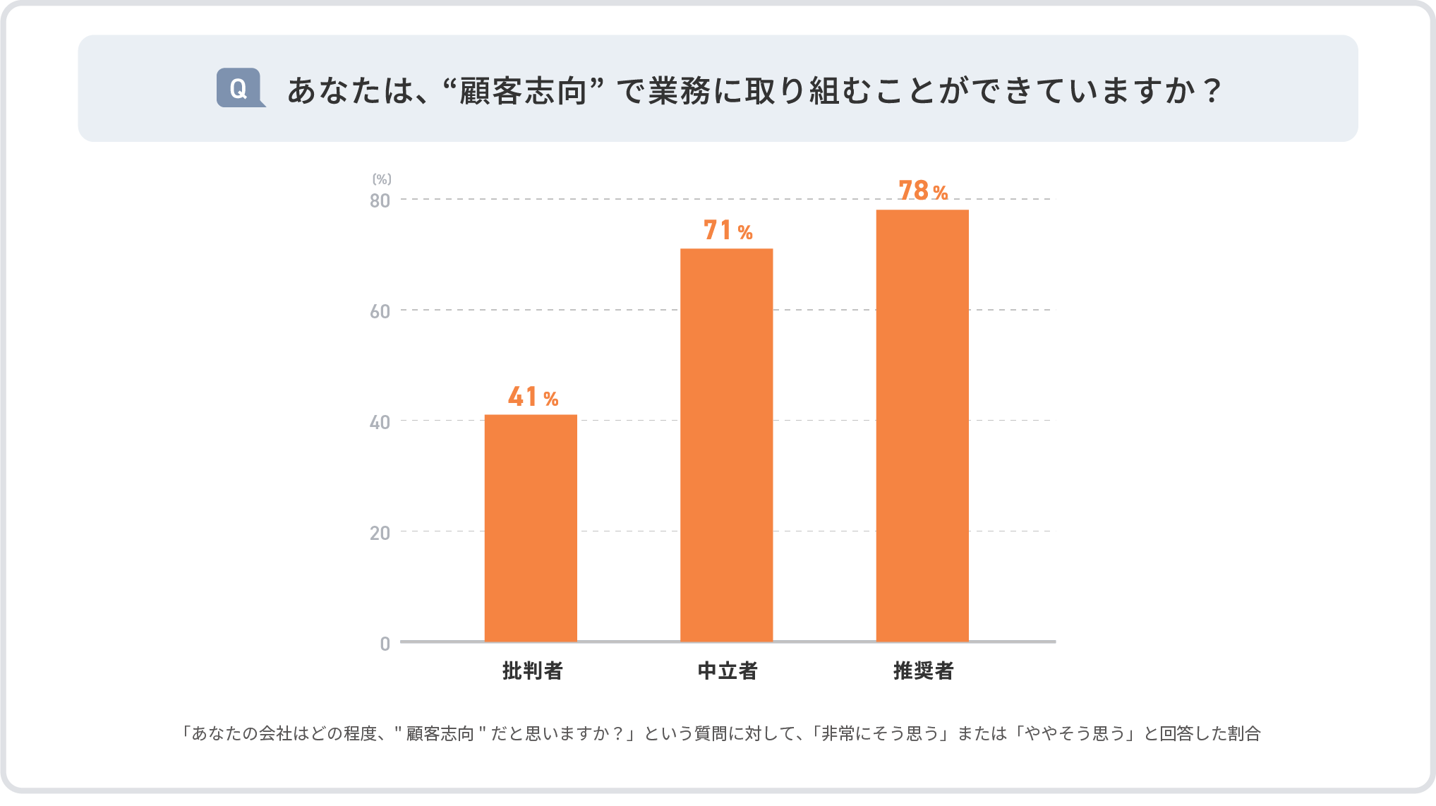 顧客志向と従業員エンゲージメントの関係性について調査を実施したところ、職場推奨度の高い人ほど、顧客志向で業務に取り組めていることが判明しました。