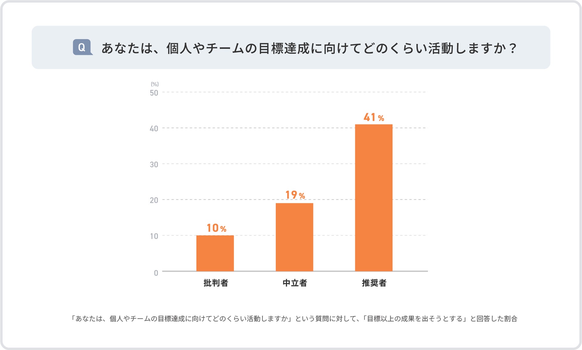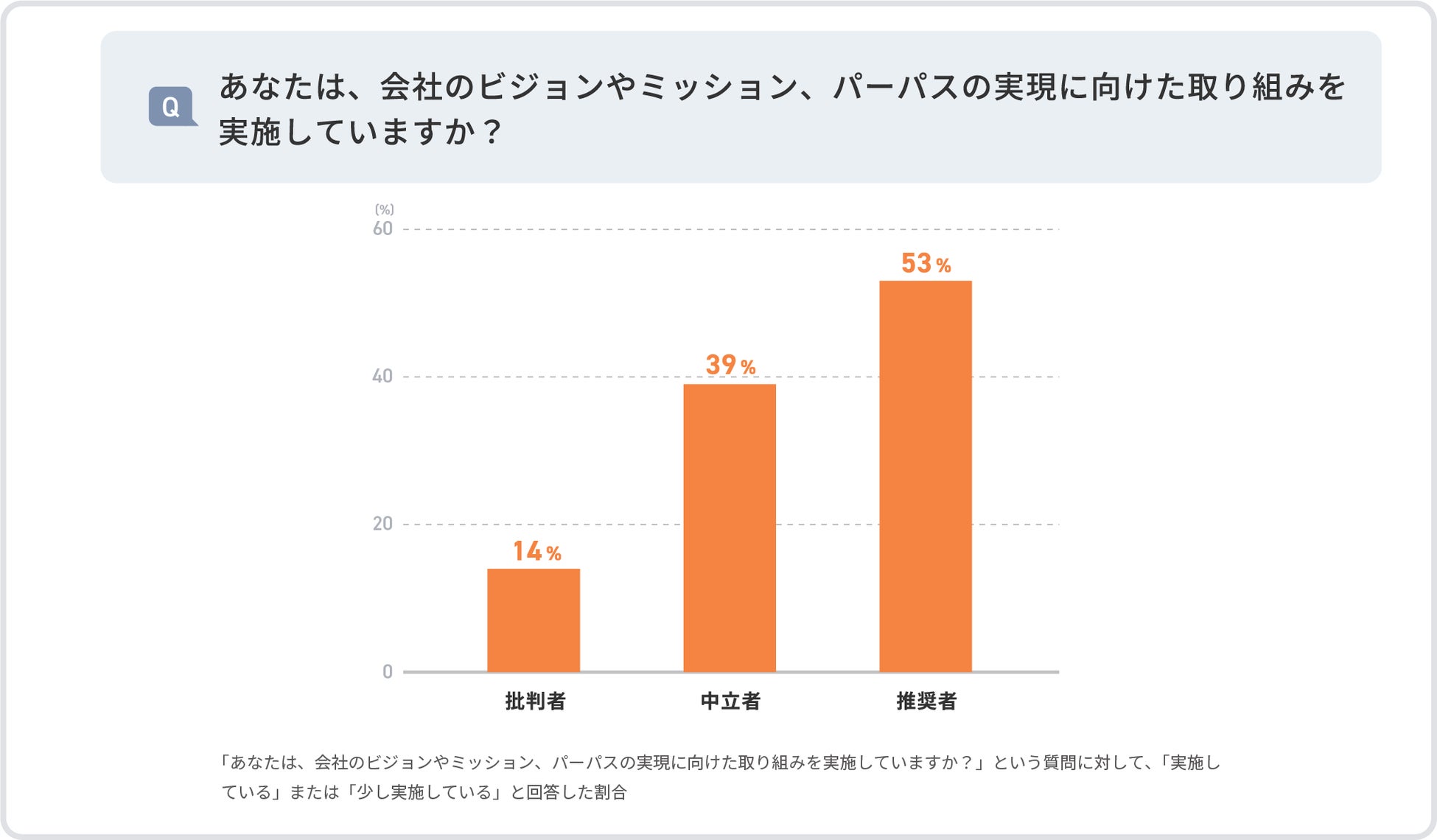 職場に対する推奨度(0~10の11段階)の質問で、9・10を選択した「推奨者」、7・8を選択した「中立者」、0〜6を選択した「批判者」に分類し、それぞれが「パーパスの実現に向けた取り組み」に対してどの程度取り組んでいるかを分析しました。その結果、推奨者の53%が何かしら取り組みを実施しているのに対し、批判者ではわずか14%にとどまりました。