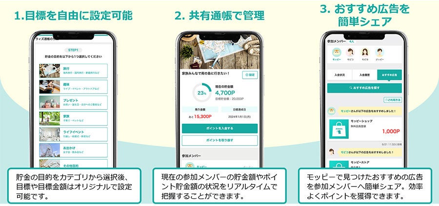 「ポイントウィズ制度」では、「友人グループで温泉旅行」や「部活やサークルの遠征費集め」、「夫婦で新居用の家電を購入」など自由に目標を設定でき、ウィズ通帳という共有可能な通帳でポイントの内訳や目標達成状況を把握できます。さらに、モッピーに掲載されているおすすめの広告を簡単にメンバーへシェアできる機能を搭載。効率よく“ポイ活(ポイントを貯めて使う活動)”を行うことが可能になります。