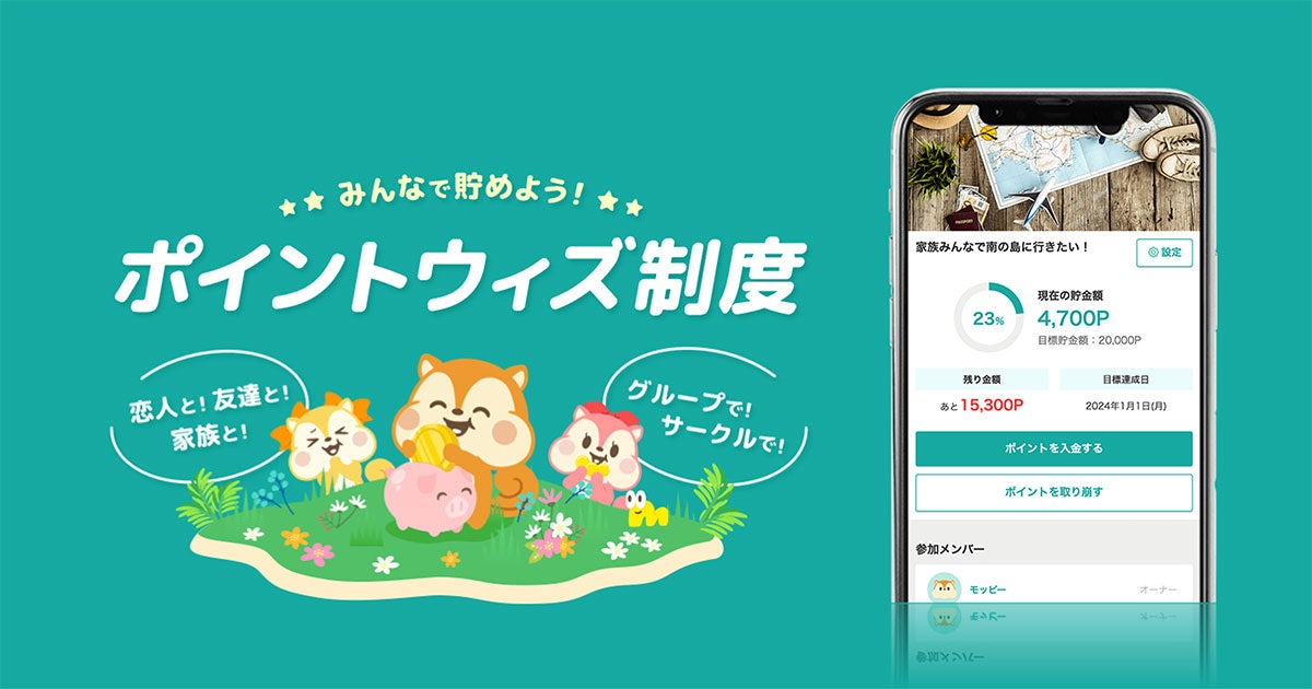 ポイントサイト「モッピー」は、このようなニーズを捉え、家族や友人と一緒に共通の目標を設定し、目標ポイントの達成を目指す「ポイントウィズ制度」を導入いたします。ポイントを利用した共同貯金は、ポイント業界初となります。
