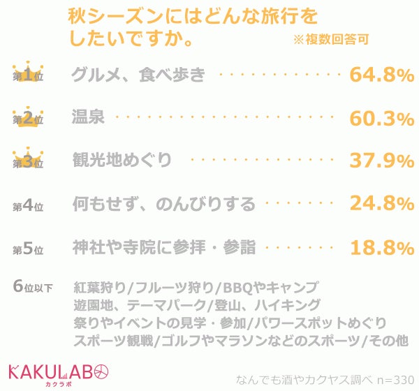 株式会社カクヤス(本社:東京都北区、代表取締役社長:佐藤順一、以下:当社)は、秋の行楽シーズンに向けて、カクヤスメールマガジンに登録している当社のユーザーを対象に、「2022年秋シーズンの旅行」についてアンケート調査を行いました。