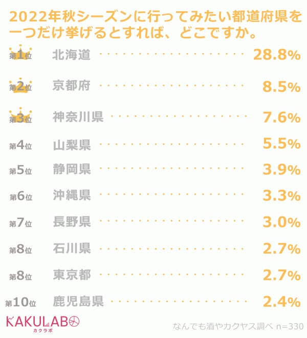 第2位は京都府。「紅葉が綺麗だから」「紅葉とお寺のコントラストが素晴らしいから」「古都の秋を楽しみたい」など紅葉推しが圧倒的でした。