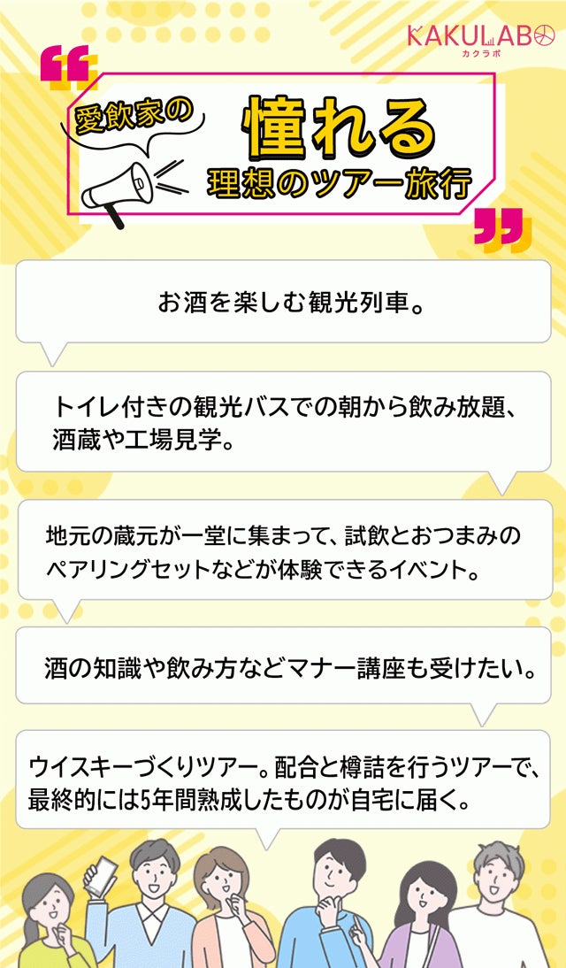 「トイレ付きの観光バスでの朝から飲み放題、酒蔵や工場見学」の「トイレ付き観光バス」や、「ワイナリーの地域で巡回シャトルバス的なものがあれば、気兼ねなく何軒も立ち寄れそう」の「巡回シャトルバス」、あるいは「ウイスキー工場見学とカスクオーナー※になれるのがセットになったツアー」の「カスクオーナー」など、お酒好きならではの視点が生かされたアイデアが集まりました。