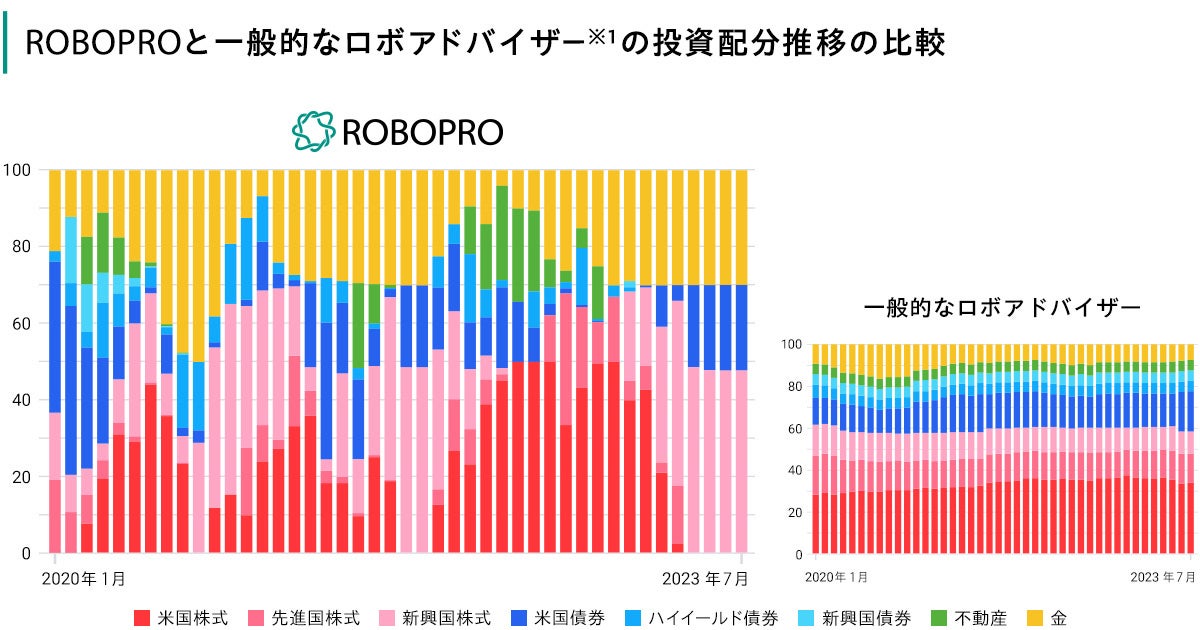 お客様の資産を世界中の株式や債券などに自動で分散投資するロボアドバイザーの中でも、ROBOPROは、AIが相場上昇・下落を予測し、資産配分をダイナミックに変更するという特徴を持つ、きわめて独自性の高いサービスです。