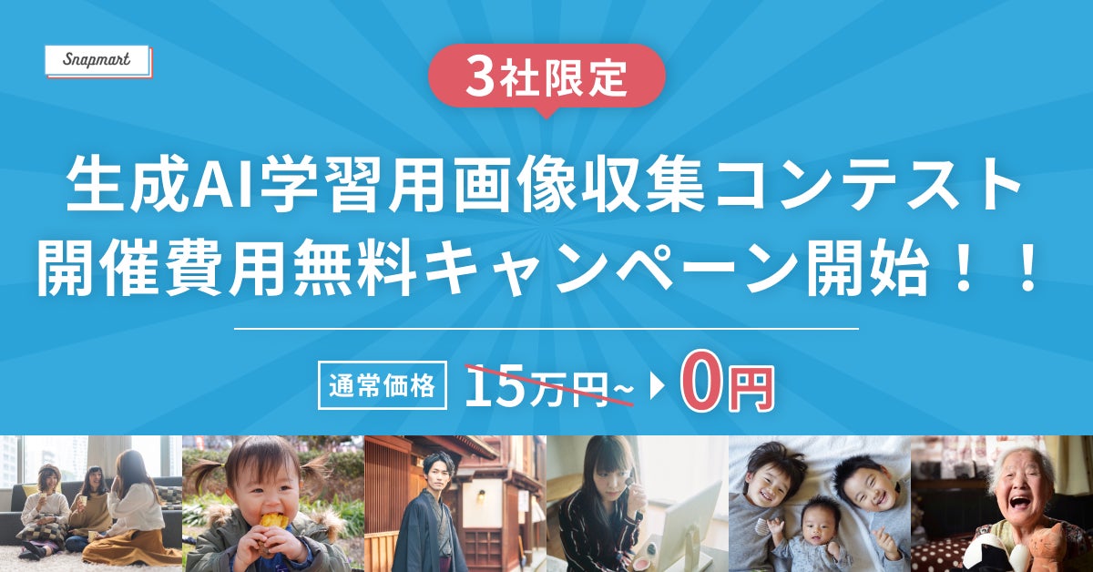 クリエイターとの共創を通じて企業のマーケティング課題を解決する、株式会社CREAVE(本社:東京都千代田区、代表取締役社長:中村真奈、以下 CREAVE)は、460万枚以上の素材からAI開発や機械学習に必要な画像素材データを一括してご提供する「Snapmart 生成AI学習素材販売サービス」のリリースを記念し、通常15万円のコンテスト開催費用が無料になるお得なキャンペーンを開催します。