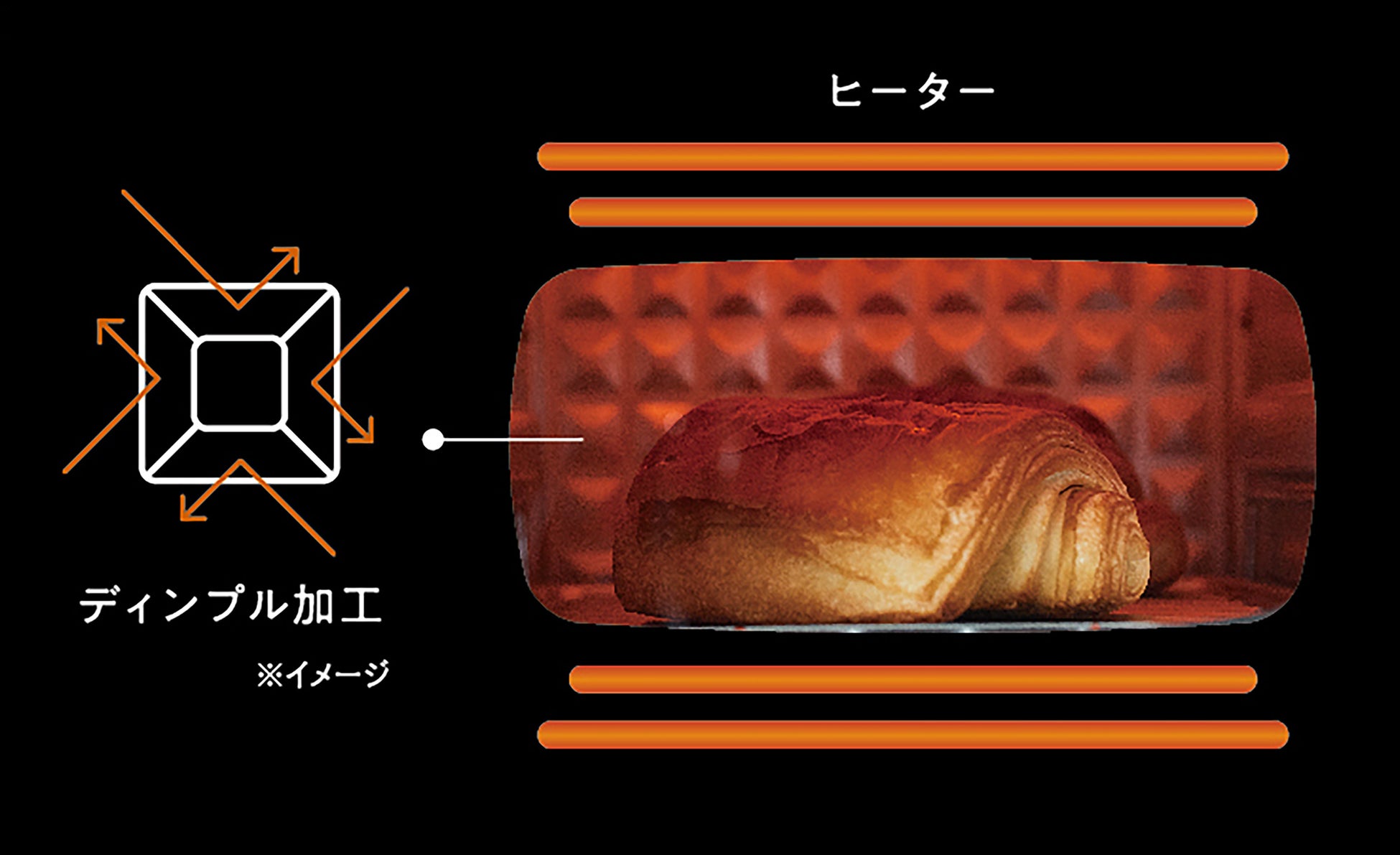 上下4本の遠赤外線ヒーターと、庫内に施したディンプル加工で熱を反射拡散。庫内の熱を効率良く、ムラなく循環させます。6つのモードは、マイコンによる温度と時間の自動制御で、ボタンひとつで理想の焼き上がりに。