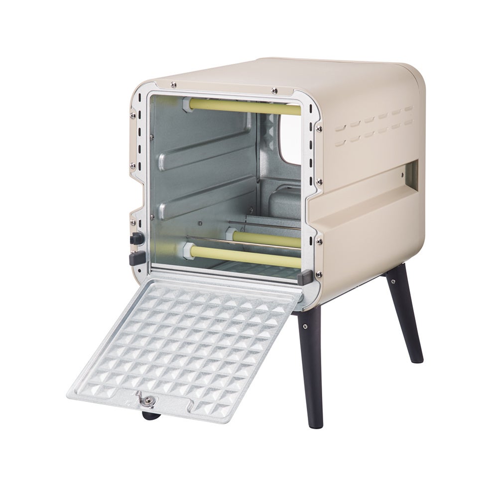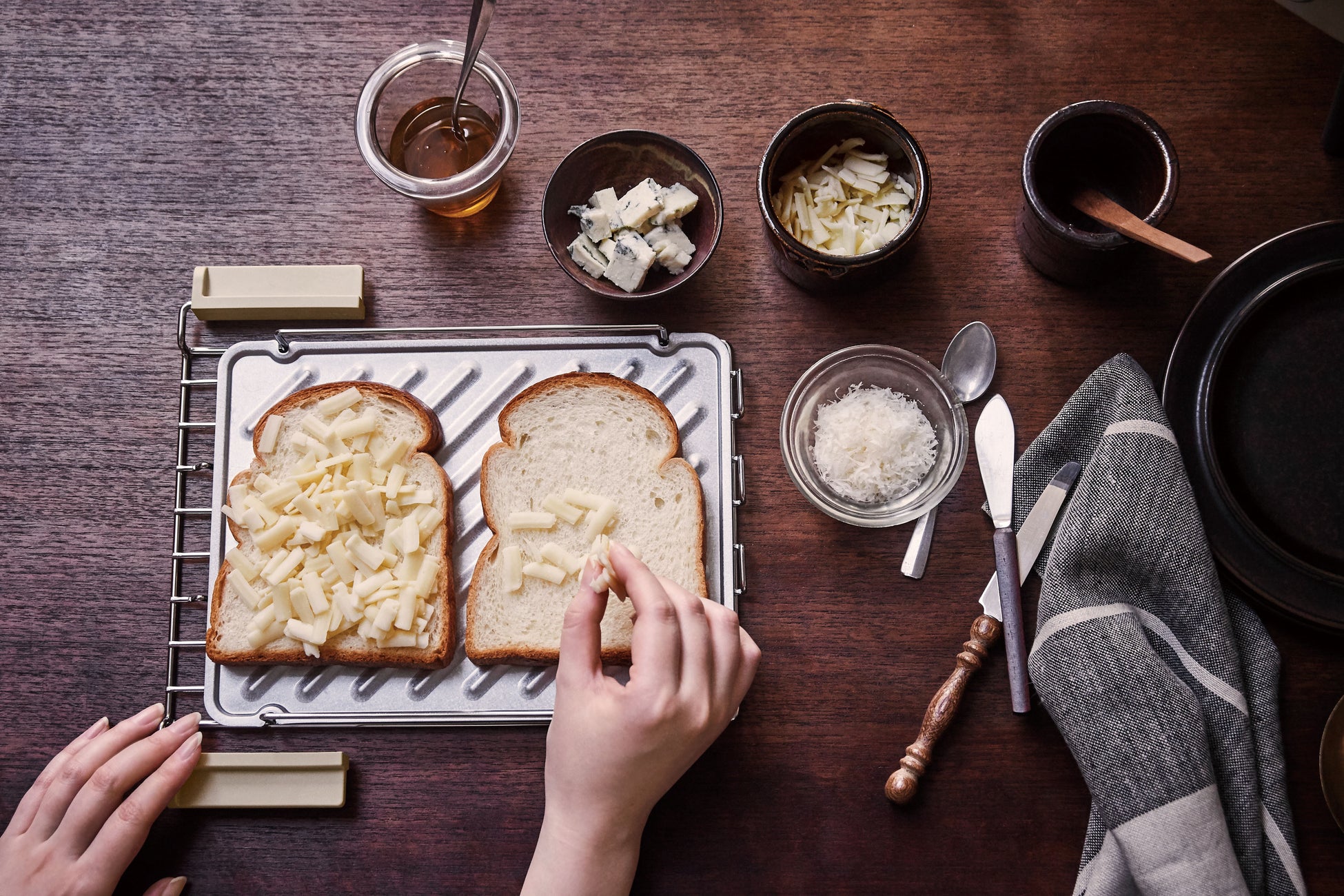 両側の持ち手を握って手前にスライドさせれば、ラック全体を引き出せ、完全に本体から取り外せる「スライドラック」。レコルトオリジナルの仕様です。「スライドラック」なら、パンや食材をのせて、焼いて、取り出す一連の動作が手際良く行えます。持ち手は熱くならないので、出来上がったらサッとすぐに取り出せて、熱々のままテーブルサーブも。(実用新案登録 第3189366号)