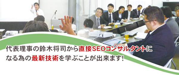 誰もが利用できる日本一のSEOコンサルタント養成機関を目指すために講師であり現役のSEOコンサルタントである鈴木将司が日頃のクライアント企業とのコンサルティング経験から導き出したSEO技術とコンサルティング技術をまとめて独自カリキュラムを作成しました。