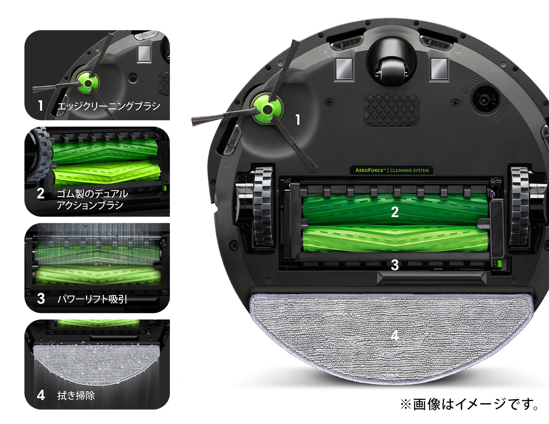 ①隅に入り込んだゴミをかき出すエッジクリーニングブラシ②床に密着してゴミをかき出し、取り除く2本のゴム製デュアルアクションブラシ③微細なごみやハウスダストも吸引するパワーリフト吸引④高性能なマイクロファイバーのモップパッド による、ルンバ独自の「4段階クリーニングシステム」で、毎日の汚れを清掃し床をキレイに保ちます。