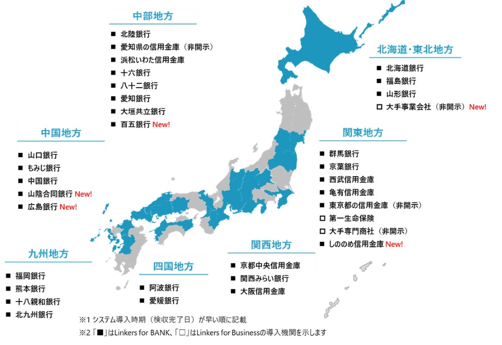 サービス提供開始以降、地域金融機関や信用金庫を中心に全国で 34 機関(*1、*2、)に導入されており、そのネットワークは順調に全国に拡大(*1、*3)しております。
