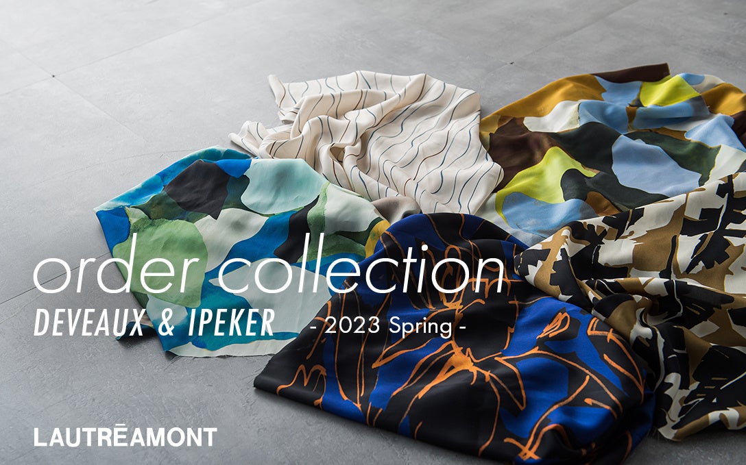 DEVEAUX 、IPEKER のプリント図案をLAUTREAMONT 別注で作り、5パターンの柄を4アイテム作りました。