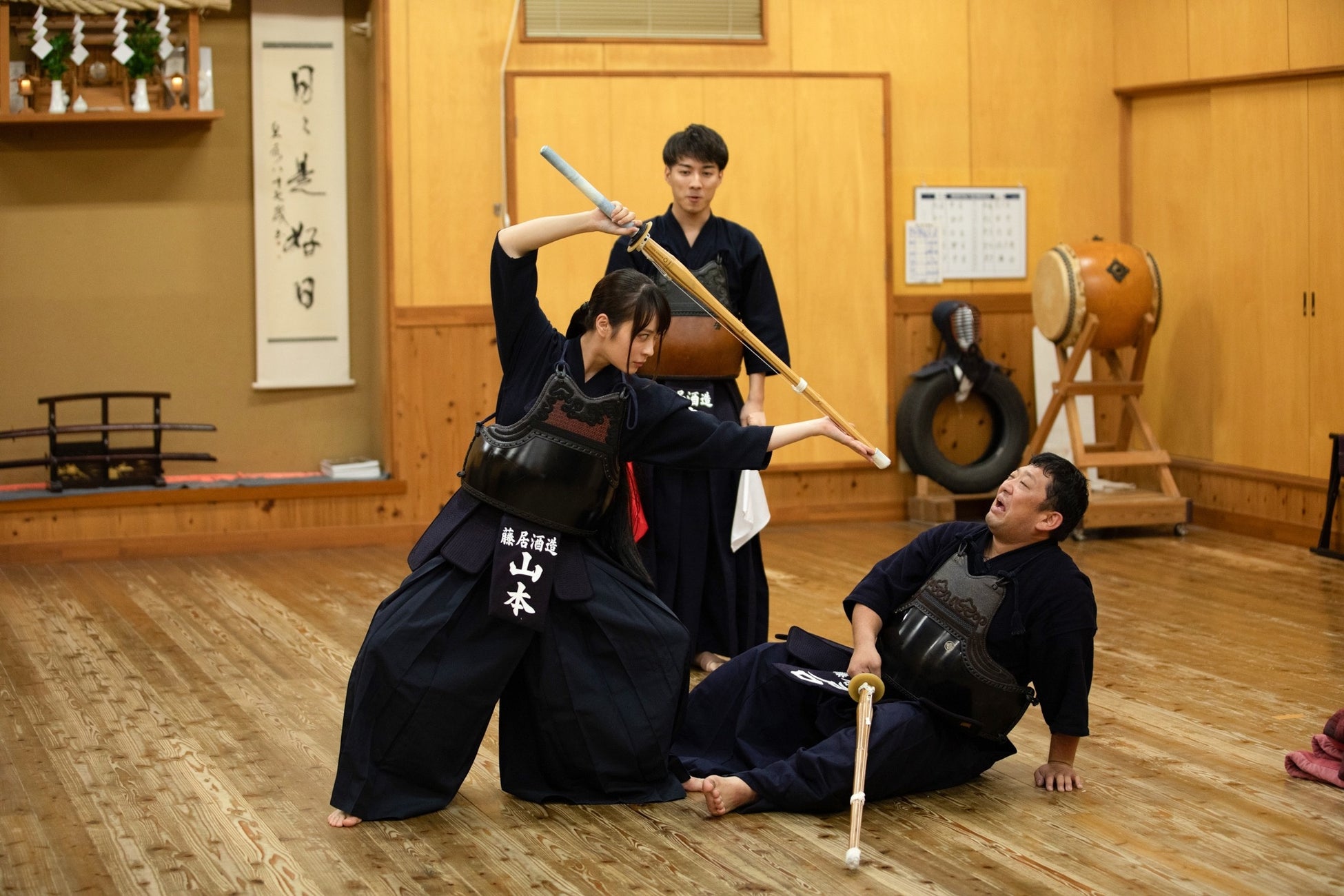 「武士道シックスティーン」で剣道ファンの心を掴んだ北乃きいが必殺剣を引っ提げ、道場に帰ってきた!?「カムカムエヴリバディ」で時代劇の大部屋俳優を好演した本郷奏多は、今度は道場で「剣道」に挑戦。仕事のために剣道をやめてしまった元有力剣道アスリートの青年社長役に挑戦する。剣道部員役に福山翔大(二段)、チャンカワイ(三段)、秋野太作(初段)の剣道有段者が名を連ね、ライバルは芸能界一の剣道好きを自任する天野浩成(三段)が鬼気迫る迫力の剣道を披露する! その他、渡辺正行(六段)や剣道ユーチューバー芸人剣道三段五段のよしき(三段)そのせん(六段)、実際の剣道界の選手や師範が随所に顔を見せ、剣道好きならクスリと笑ってしまう陣容となっている。田島芽瑠(元HKT48)と熊崎晴香(SKE48)はSNSでのファン投票を経ての出演。原田龍二は物語のキーとなる豊後の小国の剣術指南役を演じ、画面を重厚に彩った。昨年末鬼籍に入った八代亜紀は剣道好きの居酒屋の女将役を好演(本作が遺作)。そして、大女優 松原智恵子がどこか不思議な雰囲気をまとった「おばあ様」として主人公たちを見守る役どころで健在ぶりを発揮し、ガッチリ脇を引き締めた。