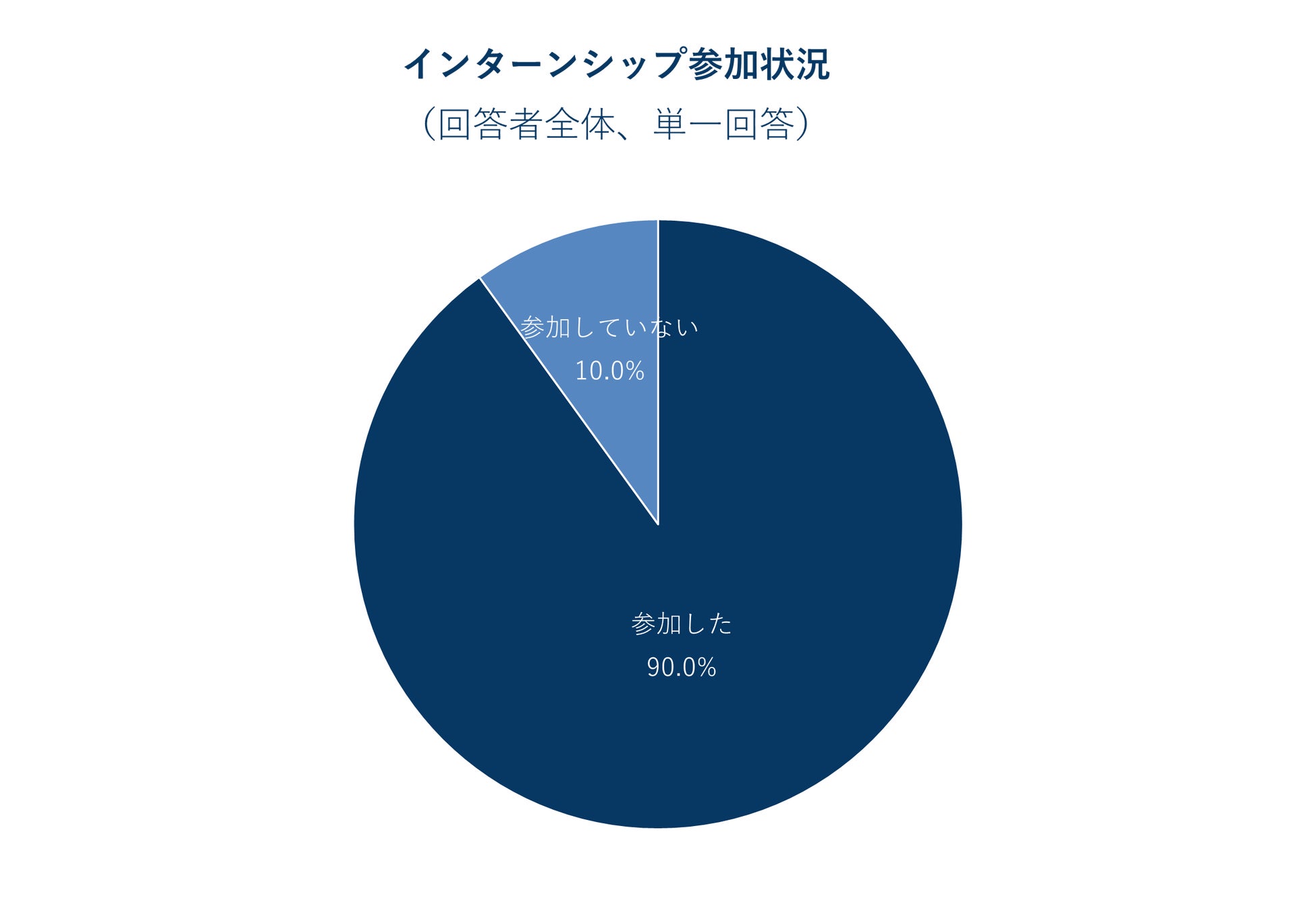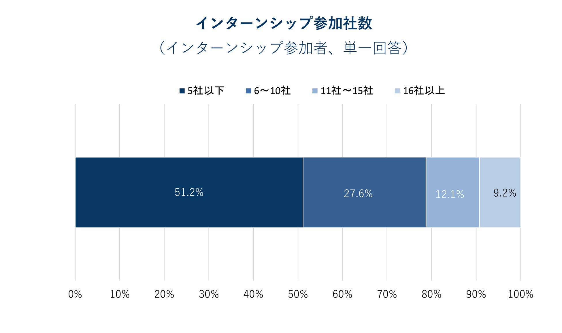 インターンシップに参加した学生の割合は9割と非常に高いが、参加社数は「5社以下」が過半数を占め、希望するプログラムをある程度絞って参加する学生が多い様子がうかがえる。