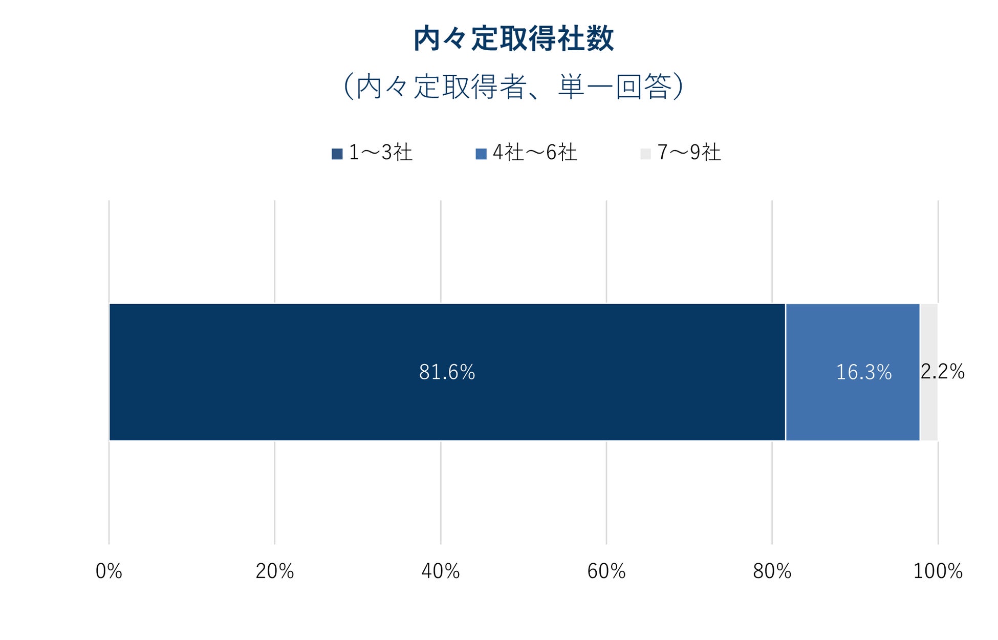 2025年3月時点で既に7割以上の学生が内々定を取得。企業の採用意欲の高さを反映し、学生にとっては早期から内々定を得やすい環境が継続している。内々定を取得した学生のうち、取得社数が4社以上の割合は約2割。