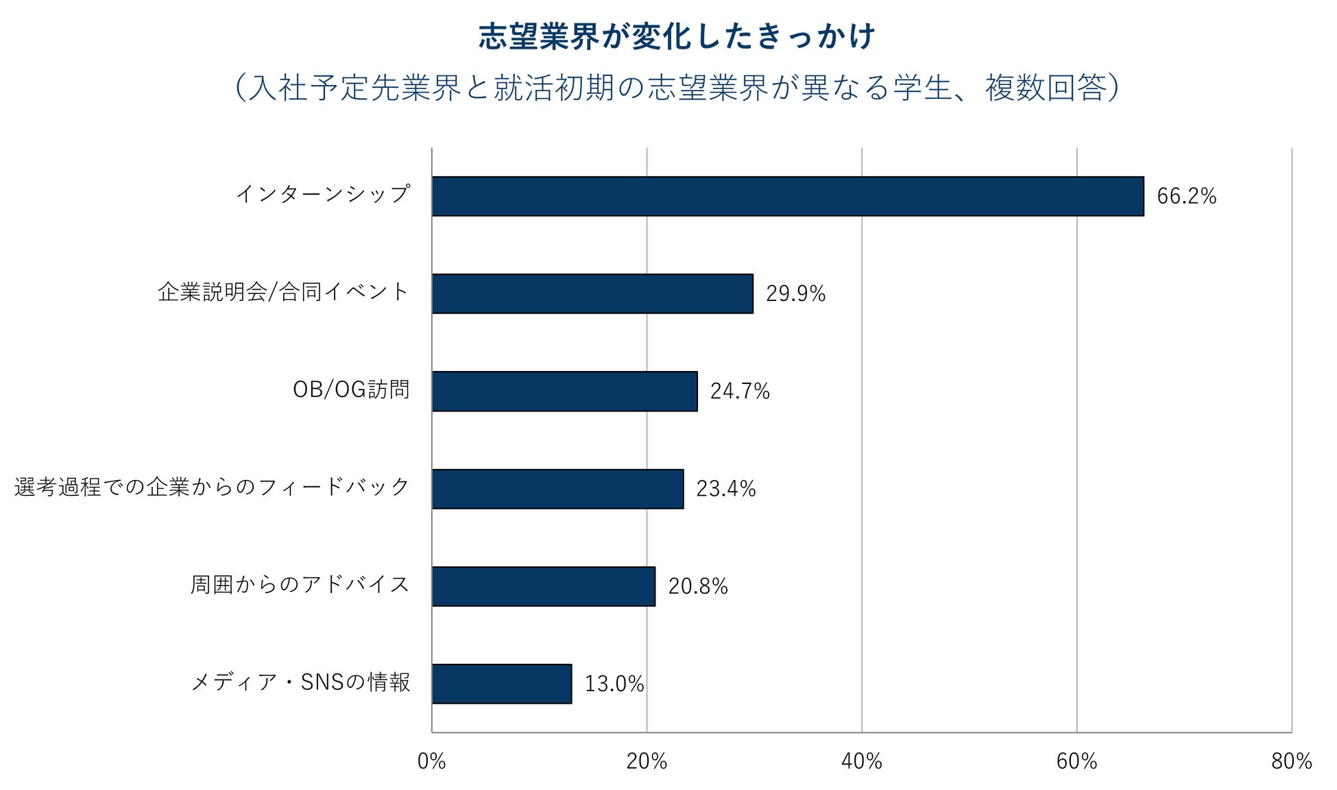 就活初期から志望業界が変化したきっかけは、「インターンシップ」が群を抜いて高く、就業体験などを通じたよりリアルな企業情報が変化のきっかけになっている状況もうかがえる。一方で、「メディア・SNSの情報」の回答割合は1割強にとどまる。