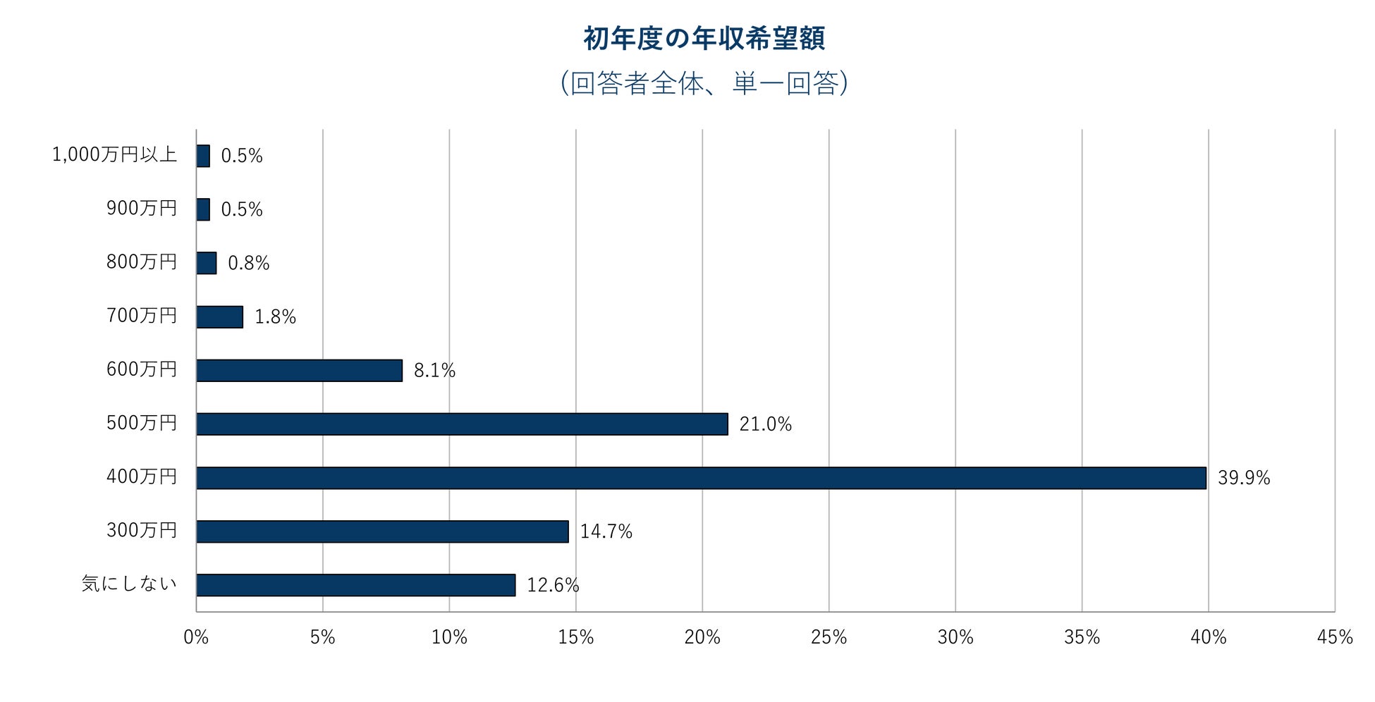 初年度の年収希望額について、「400万円」との回答が約4割で最も多い。また、昨今の初任給引き上げの動きもある中、「500万円」以上を希望する割合も3割強と一定数存在している。