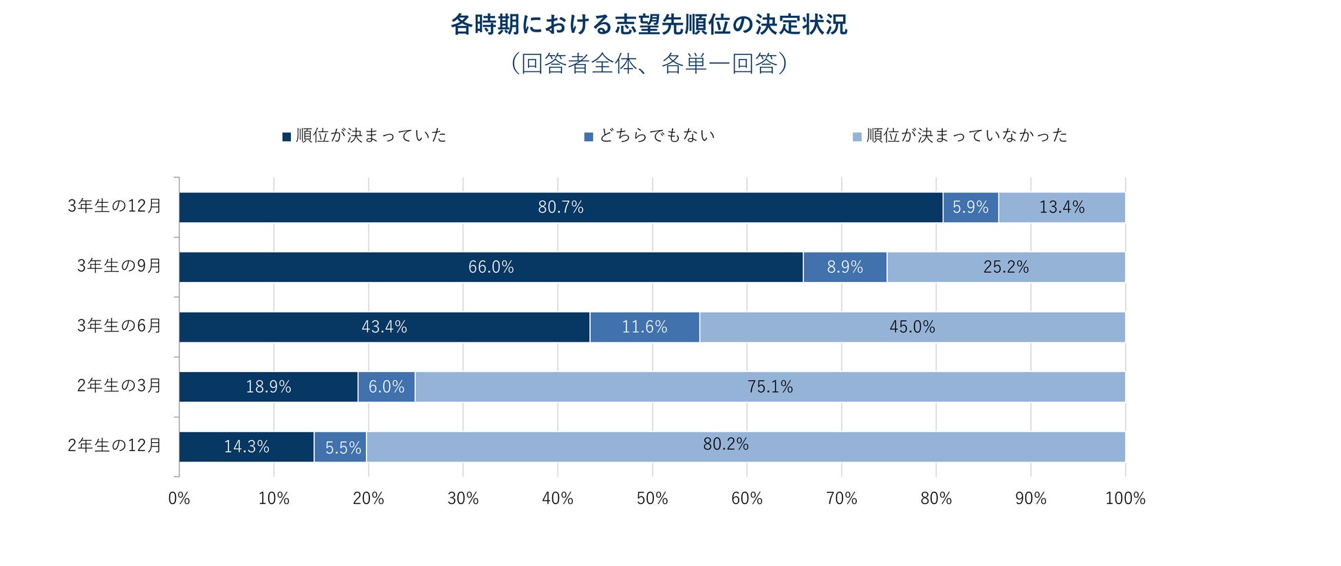 各時期における志望先企業の順位決定状況を見ると、「順位が決まっていた」割合は2年生3月~3年生9月にかけて特に上昇幅が大きく、3年生の12月には8割を超えている。