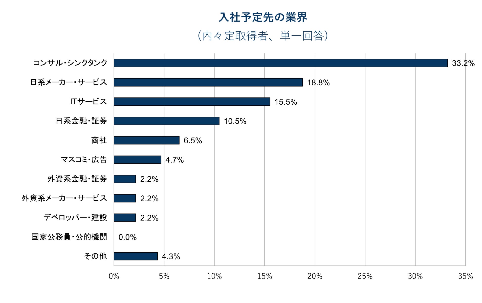 現時点で入社を予定している業界の割合は、「コンサル・シンクタンク」が群を抜いて高く、同業界の人気の高さに加え、選考時期の早さによる影響が見られる。