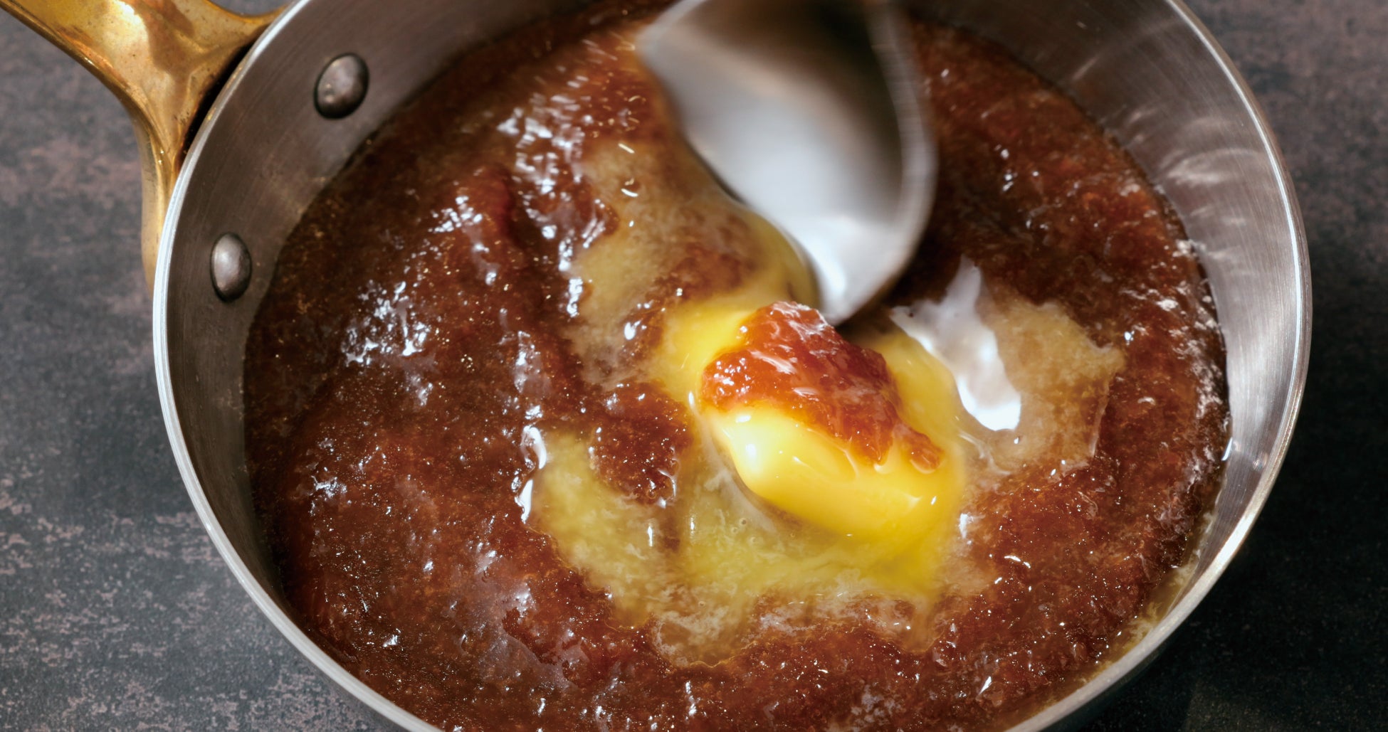 玉ねぎ・にんにく・酢・醤油を主成分とし、「低温熟成製法」で作られた熟成ソースに、提供前に店内でバターを加えひと煮立ちさせる事で、バターの芳醇な香りとコクが際立ち、まろやかな美味しさに。